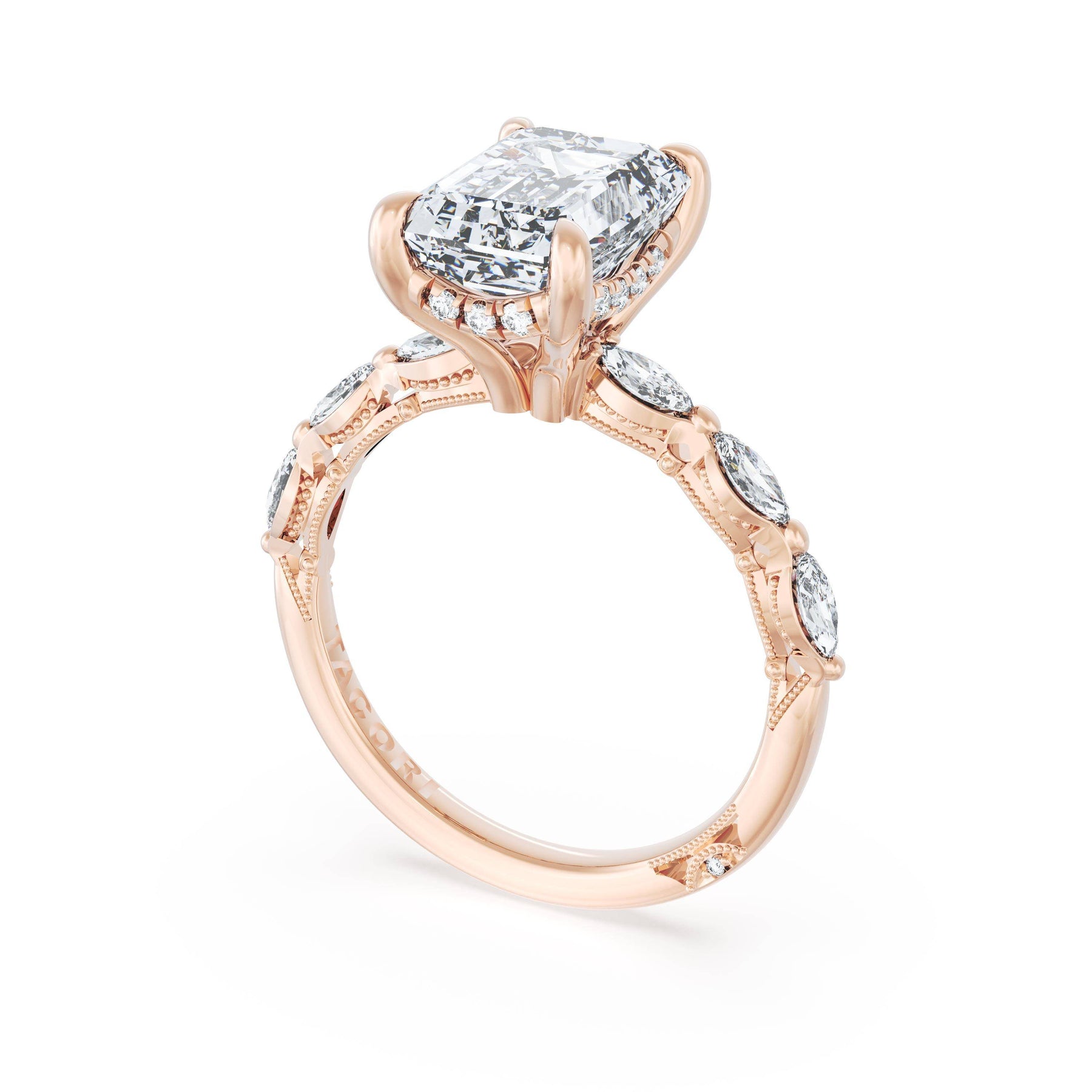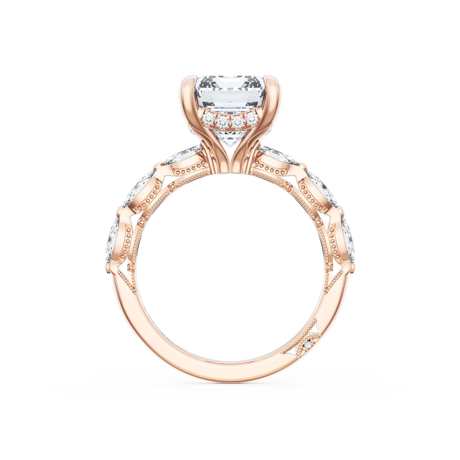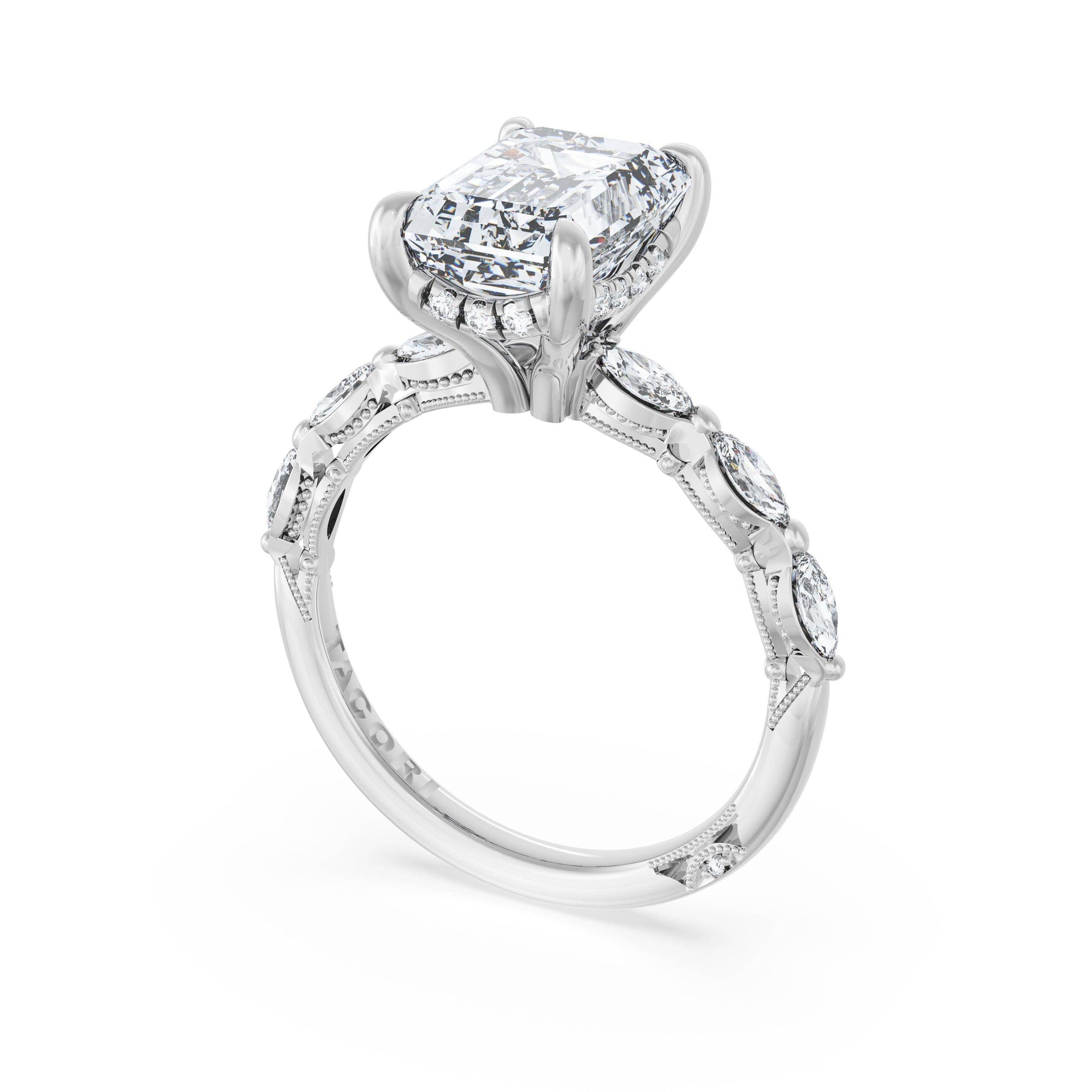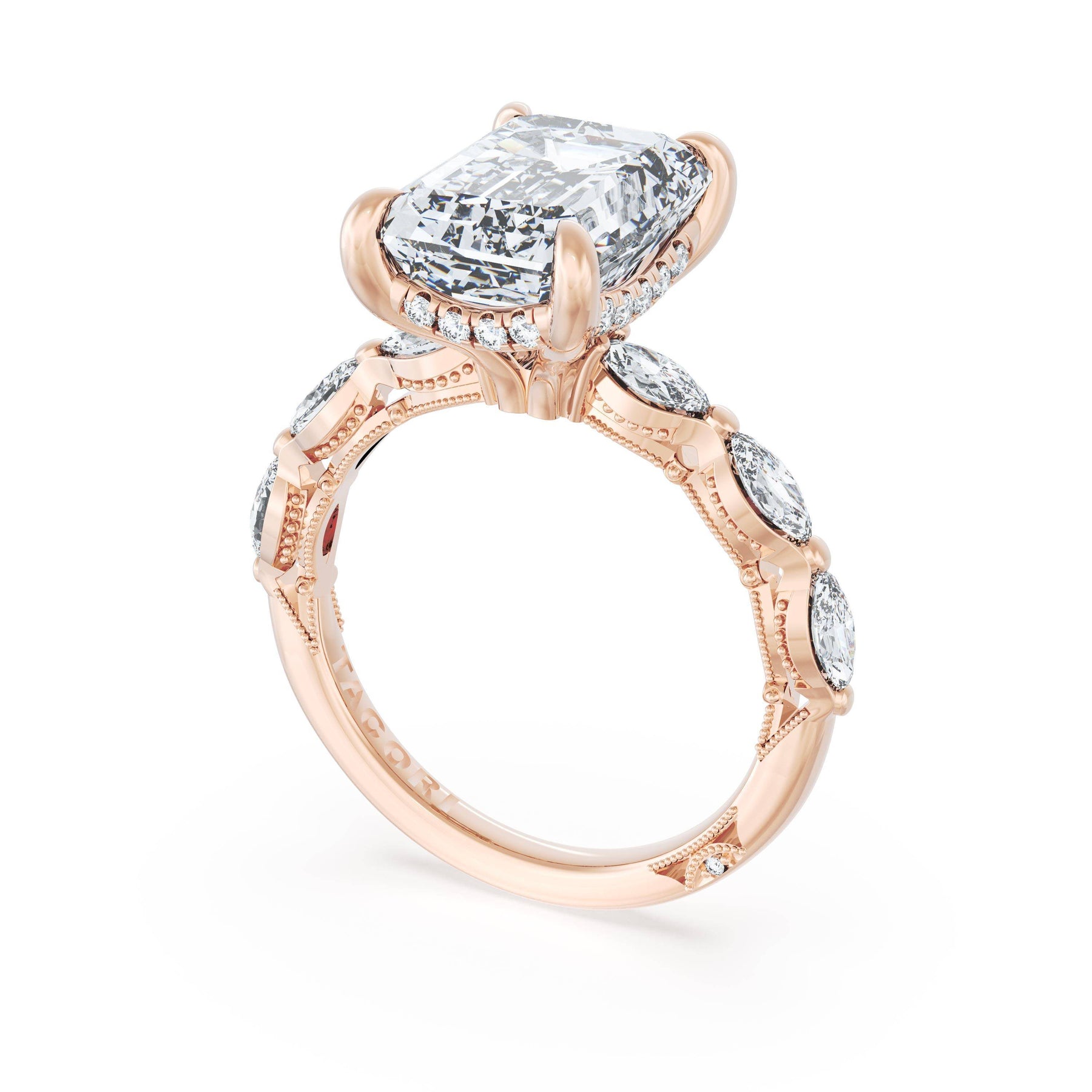 An Emerald cut center stone is set into a brilliant and mosaic-like ceiling of marquise and pear cut diamonds. Classic Crescent detailing decorates the inner face silhouette of the band.