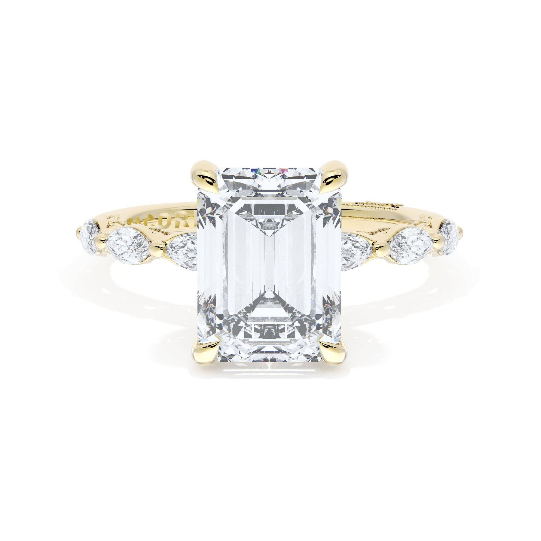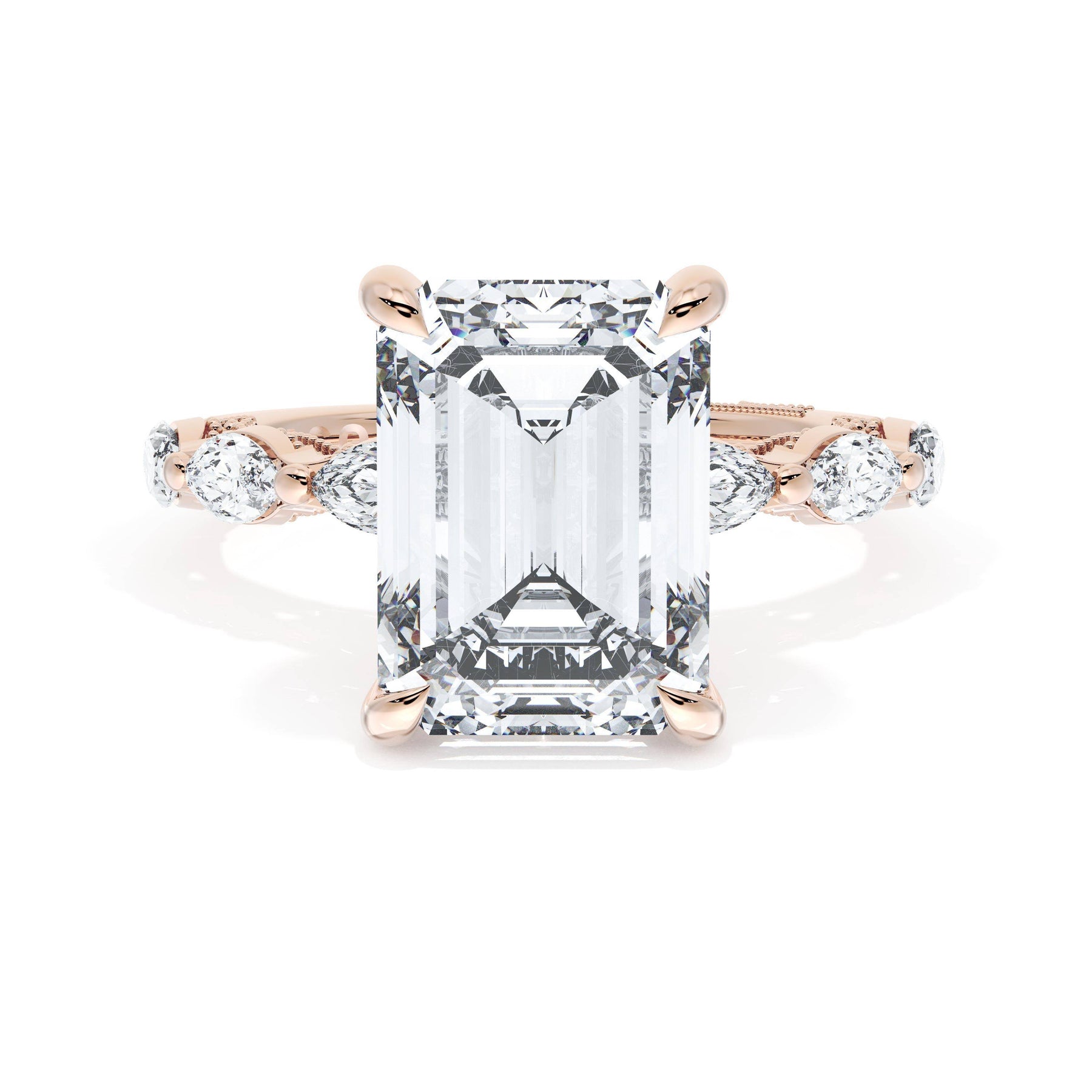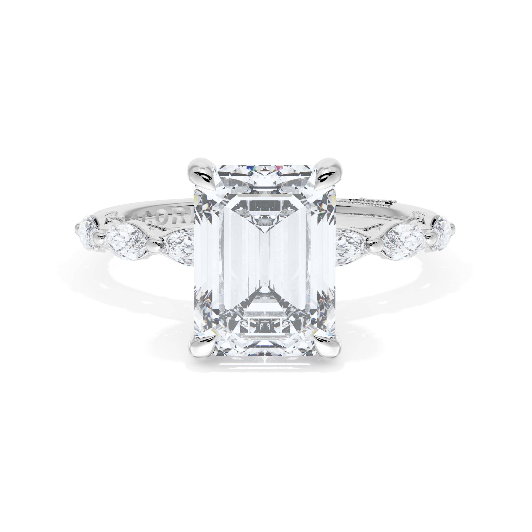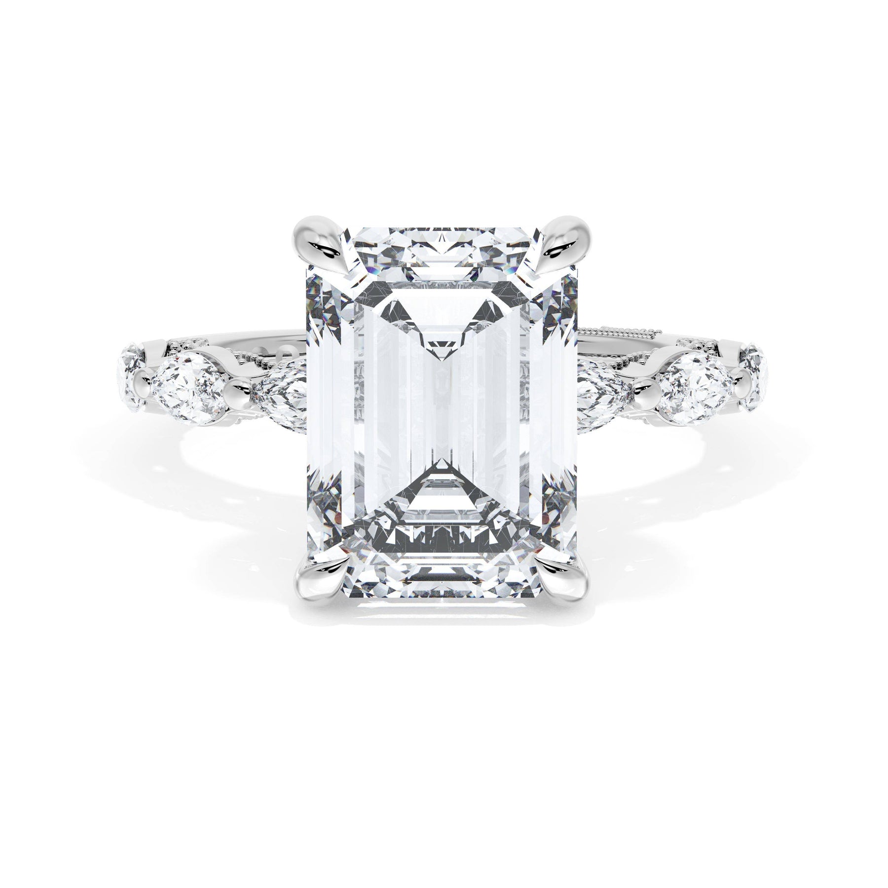 An Emerald cut center stone is set into a brilliant and mosaic-like ceiling of marquise and pear cut diamonds. Classic Crescent detailing decorates the inner face silhouette of the band.
