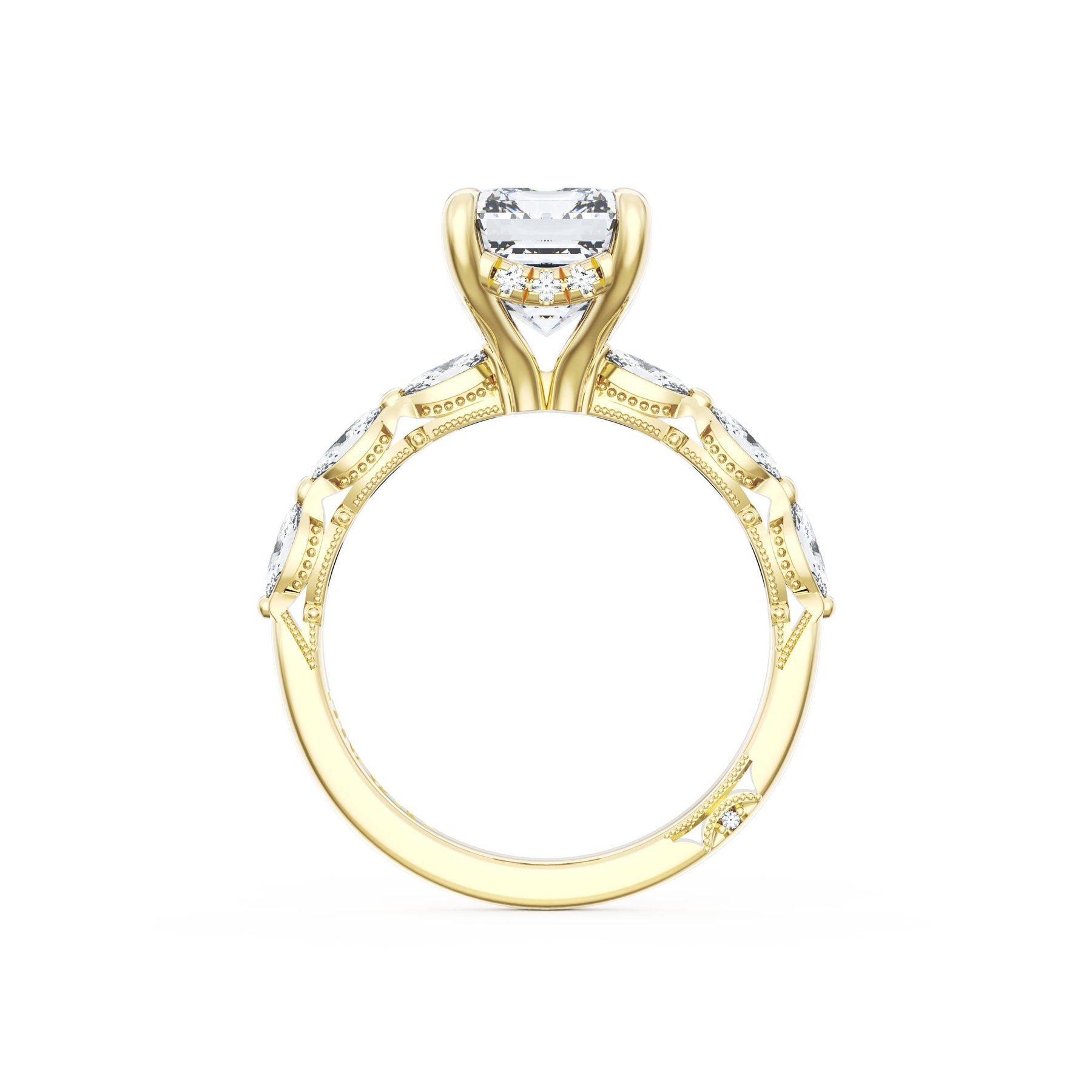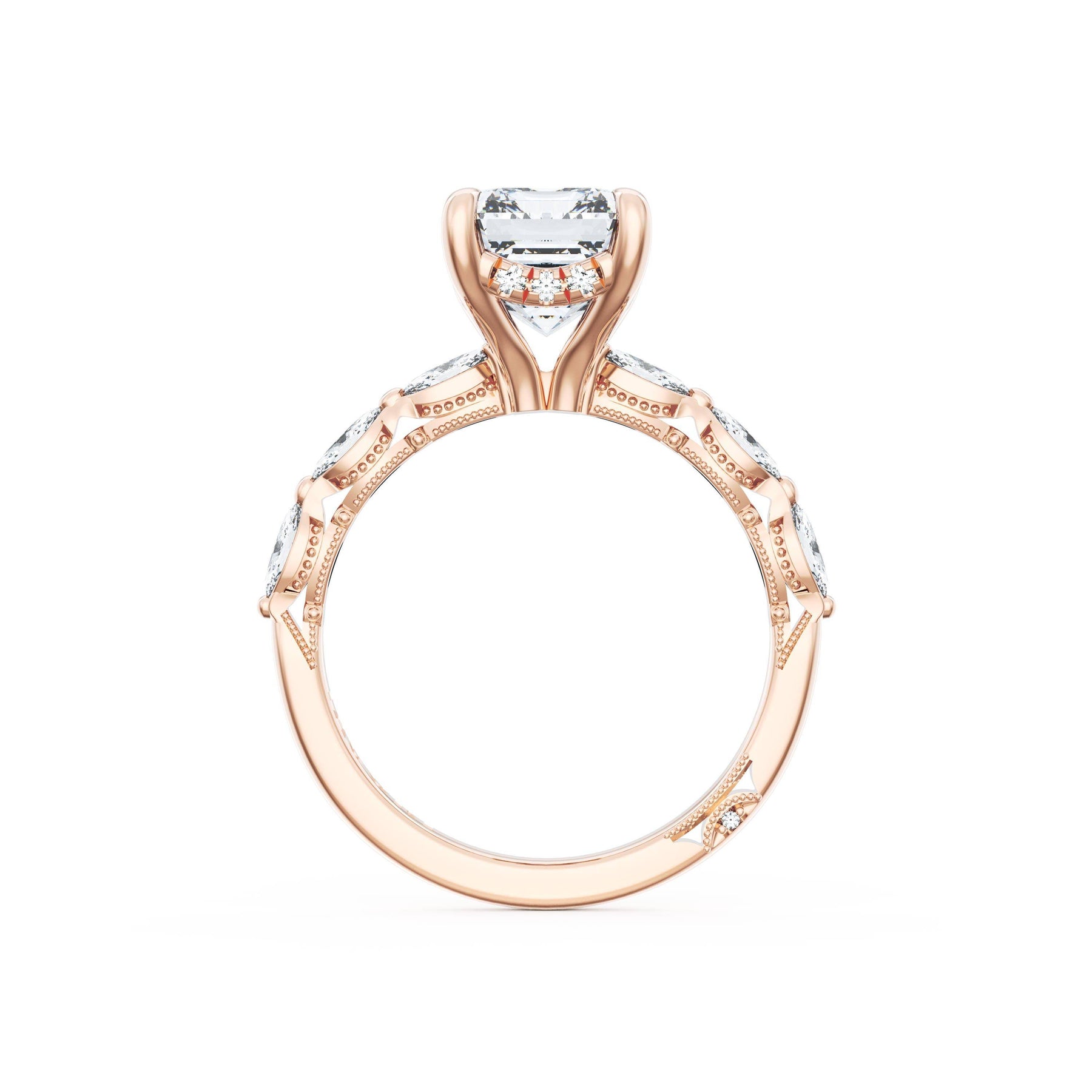 Graduating diamonds form marquise shapes along the ceiling, while Petite Crescent fabric adds windows of light and diamond detailing. A hidden bloom sits beneath the crown, and an open gallery allows for all-angle admiration of the solitaire.