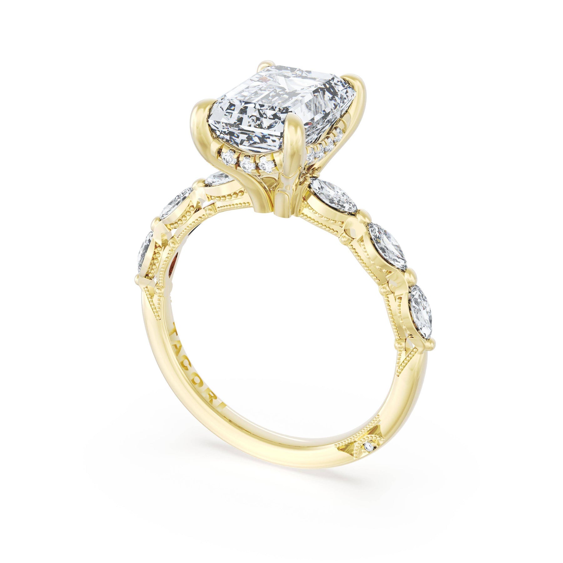 Inspired by the draping of a bridal gown, delicate milgrain layers adorn the foundation, while Simply TACORI crescent fabric on the inner face adds ornate detailing to the modern, high-polish ceiling. A Singnature Crescent marks the resting point.