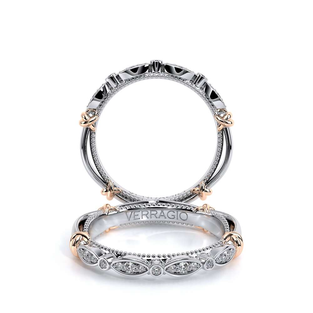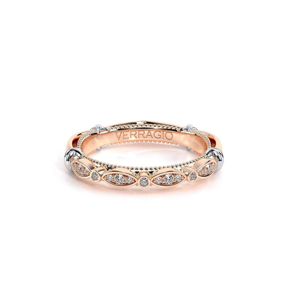 PARISIAN-141W highlights the beautiful scalloped bezel set diamonds on the straight band, featuring our rose gold Eternal wraps and Verragio signature beading details to compliment your Verragio engagement ring perfectly. **Note: +$400 for Beading in a different color
