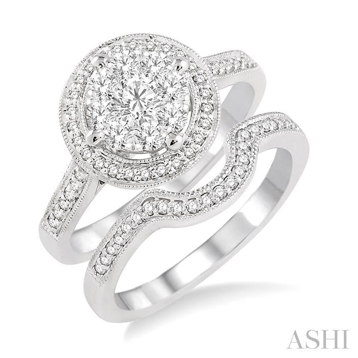 Symbolize your marriage commitment with this resplendent lovebright diamond wedding set. Styled in 14 karat glistening white gold the engagement ring is encrusted with a set of 9 gorgeous invisible set round cut diamonds at the center. Brilliant 40 pave set round cut diamonds forms a halo and lined the shank. The gleaming wedding band features 23 round cut diamonds in pave setting. Total diamond weight for the set is 3/4 ctw. Other metal types & colors may be available.