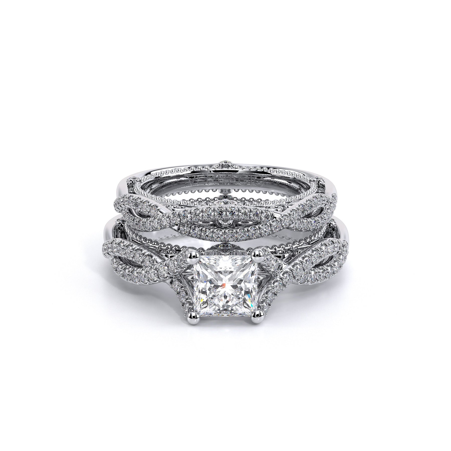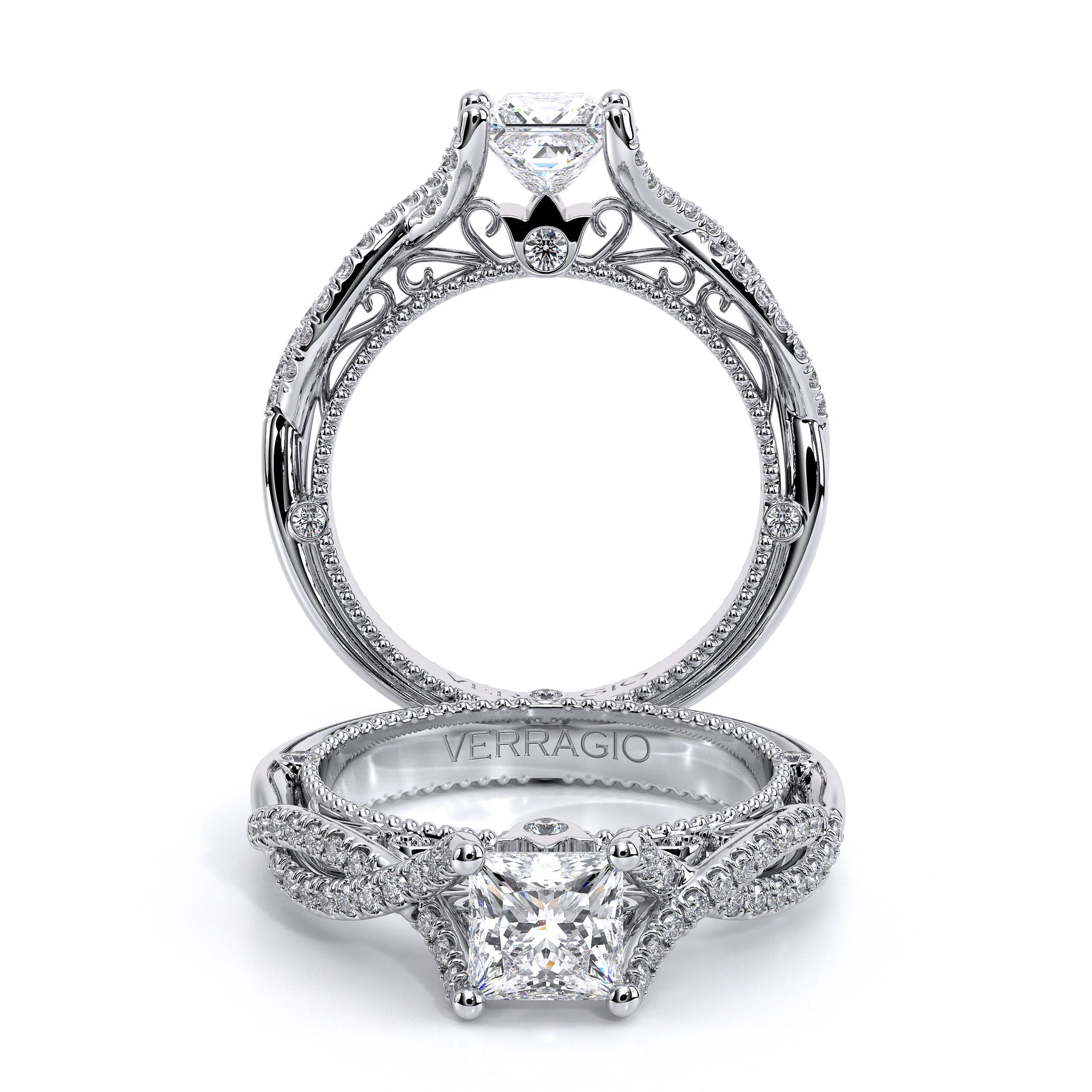 VENETIAN-5013P is a timeless representation of a three stone diamond engagement ring featuring two princess side diamonds on a twisted shank with round brilliant diamonds, all coming together in perfect harmony. A beautiful handcrafted lace and Verragio signature beading completes this stunner.