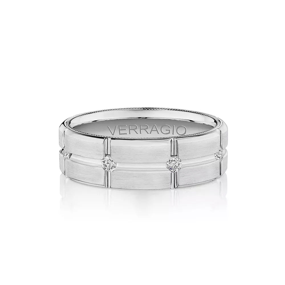 VWD-7914 is our stylish 7MM width diamond men's band with a matte finish. Along the heart of the band creating a contrast run two grooves etched in rose gold, accompanied by round brilliant cuts and enhanced by Verragio's signature beading.