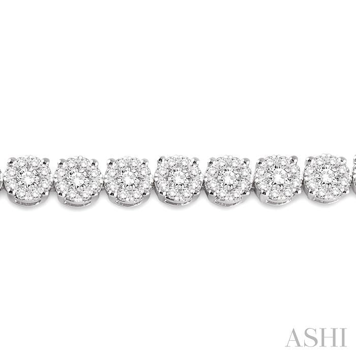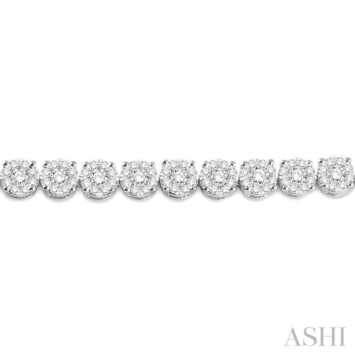 This exquisite fresh and timeless diamond lovebright tennis bracelet will complement her look and form a continuous band of brilliance around the wrist. Fashioned on luminous 14 karat white gold, this bracelet showcases shimmering 243 round cut diamonds that are set in a beautifully complementary flower motif. Diamonds are perfectly invisible set. Total diamond weight is 7 ctw. Fastens with a secure clasp. Other metal types & colors may be available.