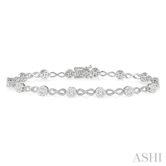 An extravagant Lovebright diamond bracelet, this certainly is a befitting piece of jewelry for royalty. It features delicate milgrain finished infinity links that hold round mounts between them, all along the bracelet length. The round mounts, a total of 14, are all embellished with round cut diamonds. There is a total of 126 invisible set round cut diamonds, one each in the center and 8 each surrounding it, meaning 9 diamonds each on every of the 14 mounts. An open box clasp secures the bracelet, with its double security feature. The bracelet is structured in 14 karat white gold. Total diamond weight is 1 1/2 ctw. Other metal types & colors may be available.