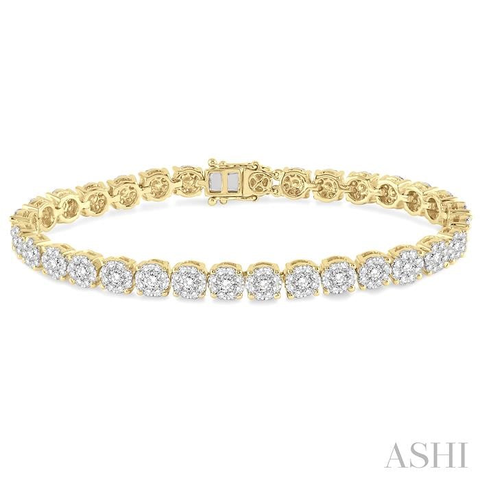 This exquisite fresh and timeless diamond lovebright tennis bracelet will complement her look and form a continuous band of brilliance around the wrist. Fashioned on luminous 14 karat yellow and white gold, this bracelet showcases shimmering 324 round cut diamonds that are set in a beautifully complementary flower motif. Diamonds are perfectly invisible set. Total diamond weight is 5 ctw. Fastens with a secure clasp. Other metal types & colors may be available.