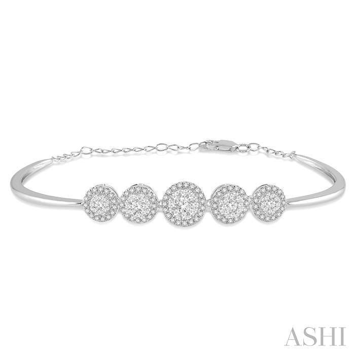 Perfect for layering, as well as for wearing by itself, this charming diamond Lovebright bangle makes an elegant addition to your jewelry box. It features a circular shape center mount, with the top border embellished with 9 invisible set round cut diamonds, one in the center and 8 haloing it. The lower border is decorated with 18 micro wall set round cut diamonds that encircle the top border. Adorning the shank are 25 each, total 50, micro wall set round cut diamonds on either side. Securing the bangle is a snap-in clasp with exterior double safety press buckles. The Lovebright bangle is styled in a polished rhodium finish 14 karat white gold. Total diamond weight is 1 ctw. Other metal types & colors may be available.