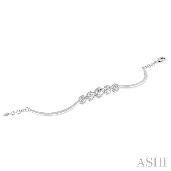 Present her this opulent diamond lovebright bracelet, a shimmering gift of love. Fashioned in gleaming 14 karat white gold this bracelet features a set of shimmering round cut diamonds, each bordered with a halo frame of smaller round cut accent diamonds and arranged in a glittering garland. Brilliant 126 round cut diamonds are set in invisible and pave settings. A lovely look with both casual and formal attire. Total diamond weight is 1 1/6 ctw. Other metal types & colors may be available.