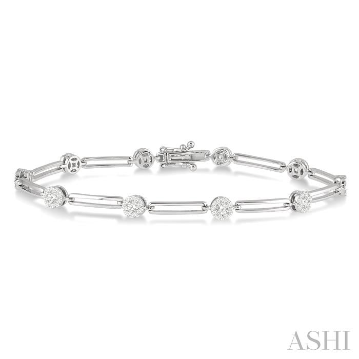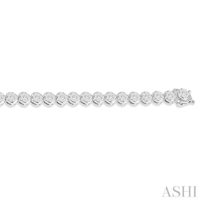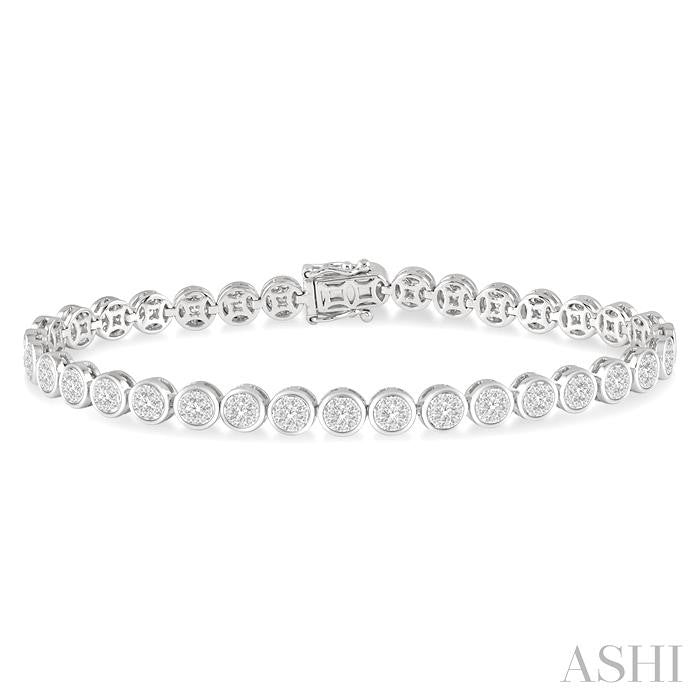 The Lovebright Collection has an enchanting assortment of droolworthy jewelry that any woman would opt for at the drop of a hat. This charismatic diamond bracelet is one such piece. It is glamorous, eye-catching and certainly attracts an envious eye. The bracelet features a link of 35 round mounts, each of which is embellished with round cut diamonds. There are 9 invisible set round cut diamonds encrusting each mount, 1 in the center and 8 encircling it, total 315 diamonds in all. An open box clasp, with side press buckles, offers dual security. The bracelet is styled in 14 karat white gold. Total diamond weight is 3 ctw. Other metal types & colors may be available.