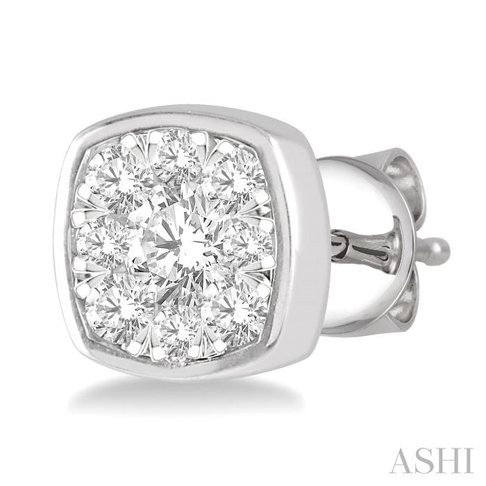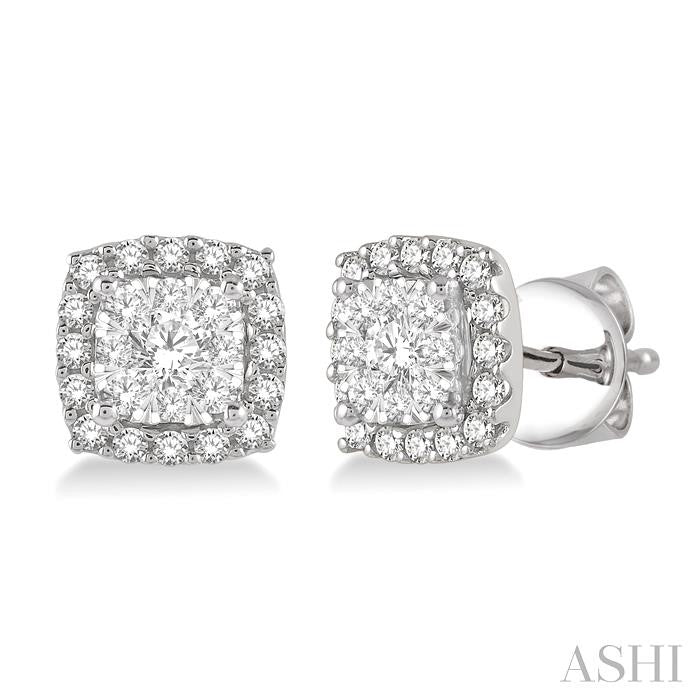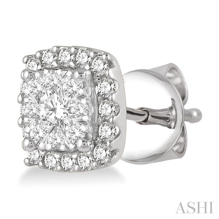 The Lovebright collection offers splendor, no matter how big or small the piece of jewelry may be. These diamond stud earrings come from this grand assemblage. The earrings feature a cushion shape, with a raised cushion shape center mount, bounded by a lower border frame in the same shape. On each earring, in the center of the top mount is a 1/20 ctw invisible set round cut diamond, haloed by 8 invisible set 1/50 ctw round cut diamonds. The bordering mount is embellished with 16 pave set round cut diamonds, 32 in total on both earrings. The stud earrings are styled in 14 karat white gold. Total diamond weight is 1/2 ctw. Other metal types & colors may be available.