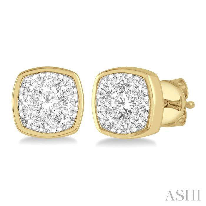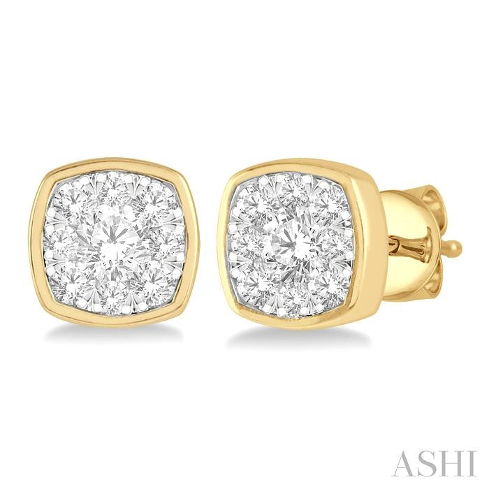 Elegant studs, these Lovebright diamond earrings are a must have pair in your jewelry case. The earrings feature a cushion shape mount that is beautifully embellished with 9 invisible set round cut diamonds each, a total of 18 diamonds on both earrings. A diamond sits in the center, while 8 diamonds encircle it. These are nestled within the mount, such that a white gold border highlights their layout. The earring is styled in 14 karat yellow and white gold and comes with push back earnut closure. Total diamond weight is 1/2 ctw. Other metal types & colors may be available.