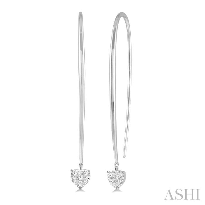 A petite diamond heart shape earring from the Lovebright collection, this makes for a must-have in your wardrobe. It features a pair of tiny heart shaped mounts that dangle from Shepherd's hooks. The little hearts are embellished with round cut diamonds. There are 7 each invisible set, a popular setting style for Lovebright jewelry, round cut diamonds decorating each of the two hearts, one on the left and the other on the right earring. The earring is sculpted in 14 karat white gold. Total diamond weight is 1/3 ctw. Other metal types & colors may be available.