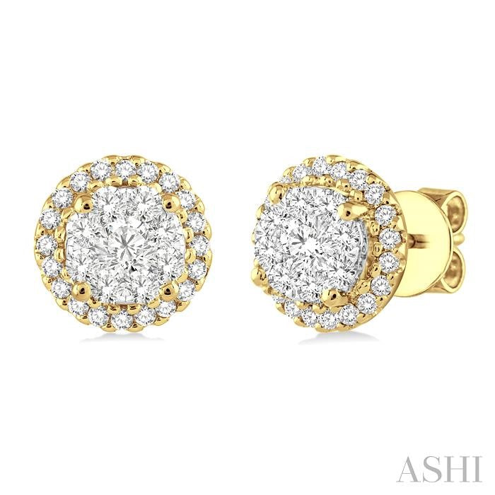 Add a dash of style to your repertoire with these classy lovebright diamond earrings. Lavishly crafted in luminous 14 karat yellow and white gold these gorgeous diamond earrings feature 54 round cut accented diamonds, perfectly invisible and pave set. These treats closes with a secure clasp. Total diamond weight is 3/4 ctw. Other metal types & colors may be available.