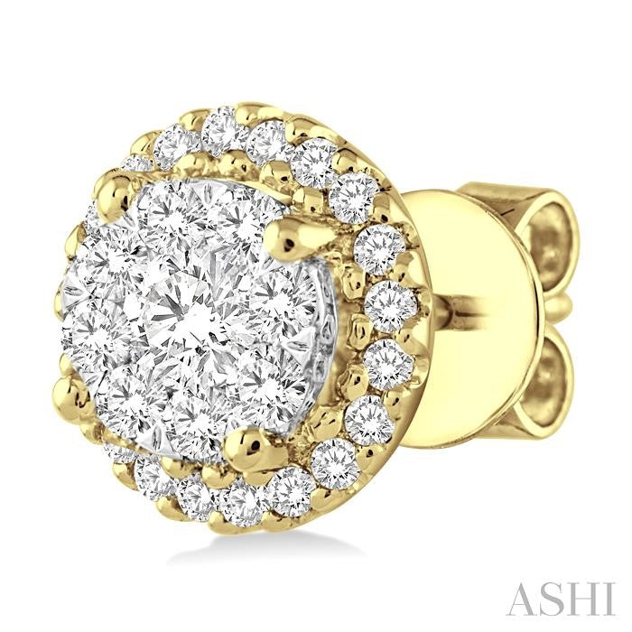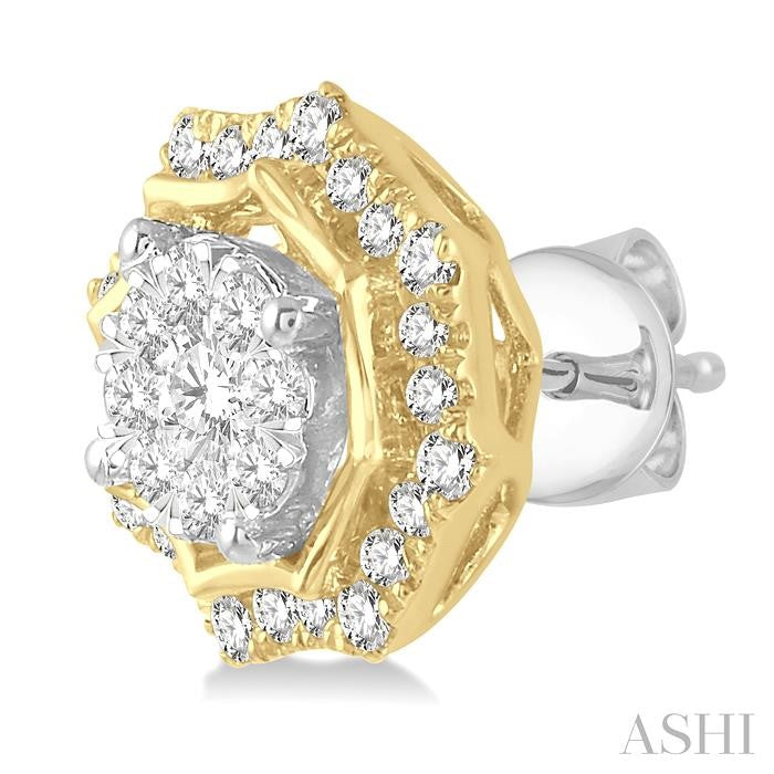 An eye-catching pair of Lovebright diamond stud earrings, these make a sophisticated addition to your evening wear accessories. The earrings feature a star shape Lattice border, around a round mount that nestles in the center. The round center mounts, which are in 14 karat white gold, is embellished with 9 each invisible set round cut diamonds, a total of 18 on both mounts. The yellow gold star border is encrusted with 24 micro wall set round cut diamonds, a total of 48 on both earrings. The Lovebright earring is styled in 14 karat yellow and white gold. Total diamond weight is 1/2 ctw. Other metal types & colors may be available.