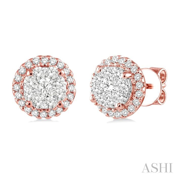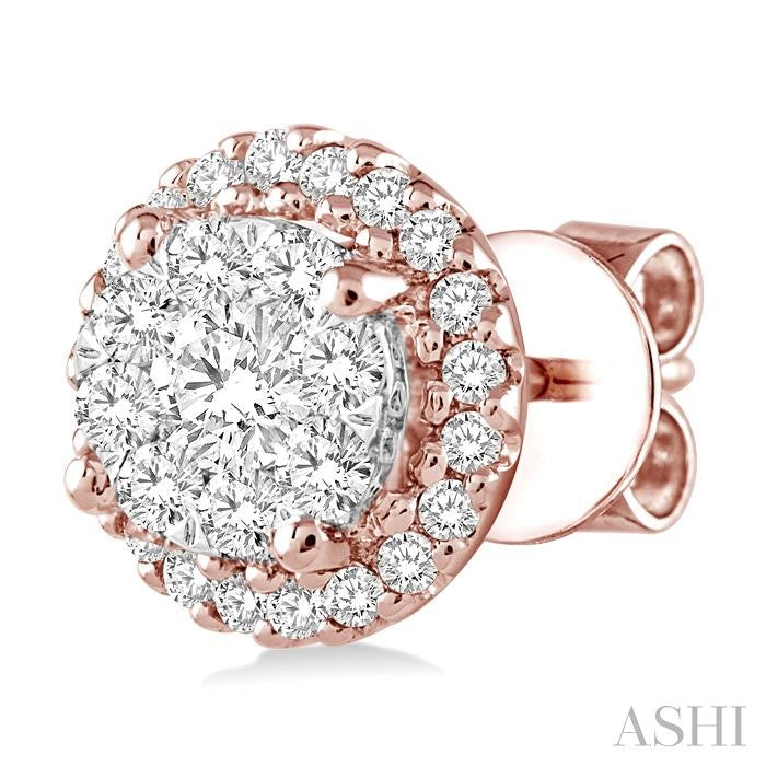 Add a dash of style to your repertoire with these classy lovebright diamond earrings. Lavishly crafted in luminous 14 karat rose and white gold these gorgeous diamond earrings feature 50 round cut accented diamonds, perfectly invisible and pave set. These treats closes with a secure clasp. Total diamond weight is 1/2 ctw. Other metal types & colors may be available.