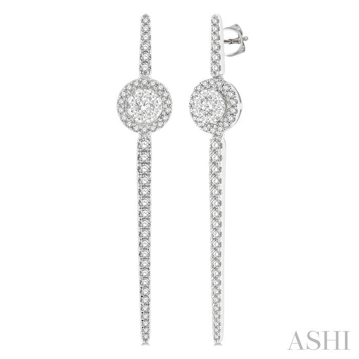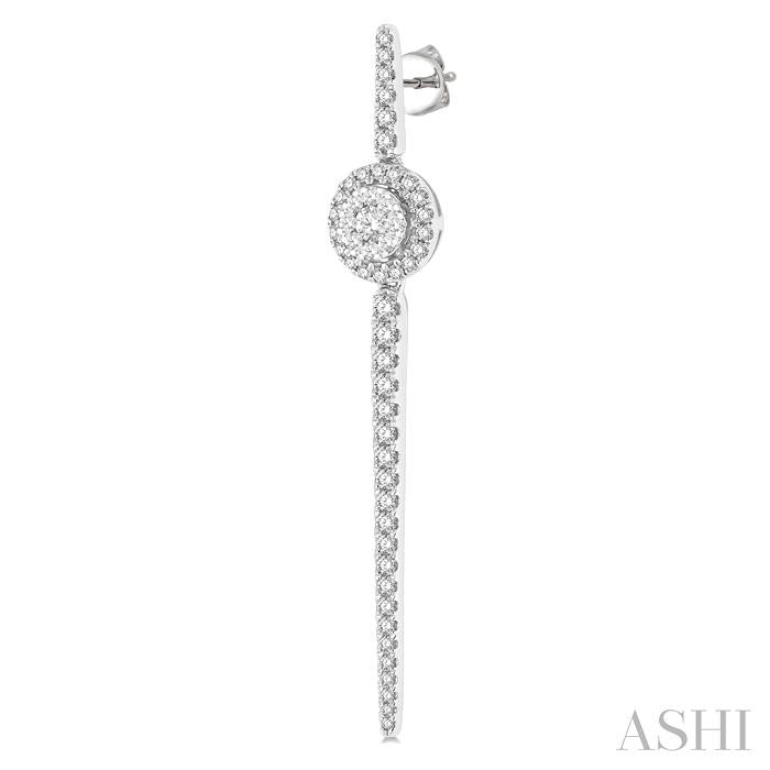 The Lovebright Collection offers a magnetism that draws anyone and everyone to its alluring assemblage. This pair of diamond long earrings comes from the mesmerizing collection. It showcases a long bar with rounded tips, and an round shape mount at a quarter length from above along the bar. The 2-tiered round mount features 9 each invisible set round cut diamonds on the raised middle, and 18 each micro wall set round cut diamonds haloing it from the lower tier. 27 each micro wall set round cut diamonds embellish the bar on each earring. There is a total of 108 diamonds on the earring pair, which is styled in 14 karat white gold. Total diamond weight is 1 ctw. Other metal types & colors may be available.