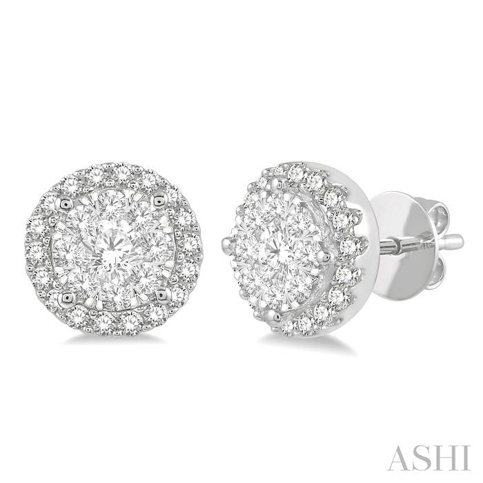Dress her ears in style and shimmer with these diamond lovebright earrings. Fashioned in 14 karat white gold, these earrings features a center array of shimmering round diamonds set in a circular-shaped frame. A halo frame of smaller round accent diamonds surrounds this center array along with the front edge in sparkling design. 74 Diamonds are set in invisible and prong settings. Total diamond weight is 1 ctw. Other metal types & colors may be available.