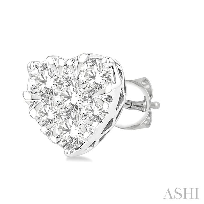 Add a touch of glamour to any outfit with these stunning Lovebright Petite diamond fashion stud earrings, a perfect accessory to elevate your style on any occasion. The earrings feature a striking heart-shaped mount that dazzles with a cluster of round cut diamonds. Each mount is skillfully adorned with 7 invisible set round cut diamonds, 1 in the center and 8 surrounding it, sparkling with unmatched brilliance. The Lovebright Petite diamond fashion stud earrings are sculpted in a rhodium finish 10 karat white gold. Total diamond weight is 1/6 ctw. Other metal types & colors may be available.