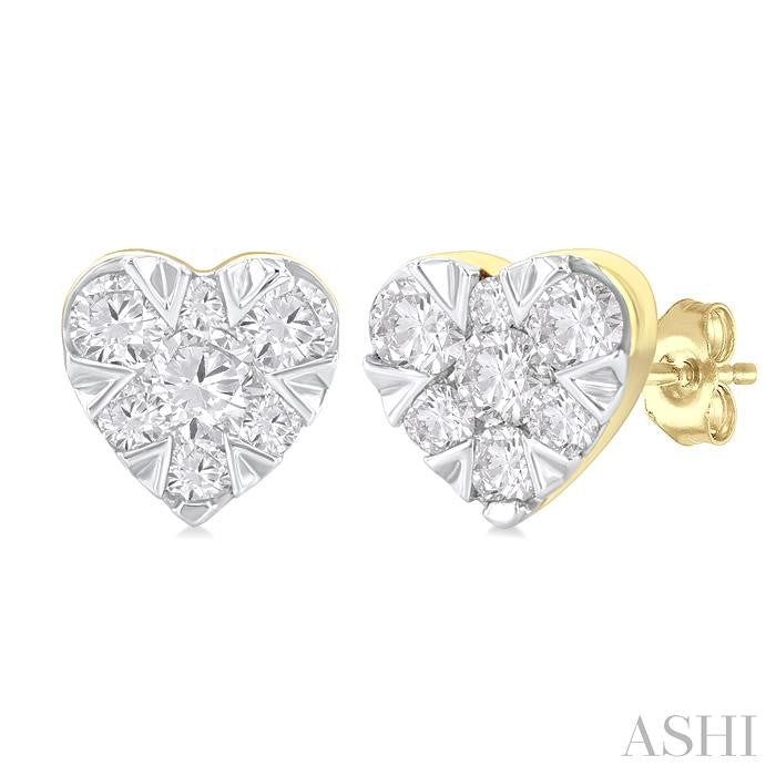 Add a touch of glamour to any outfit with these stunning Lovebright Petite diamond fashion stud earrings, a perfect accessory to elevate your style on any occasion. The earrings feature a striking heart-shaped mount that dazzles with a cluster of round cut diamonds. Each mount is skillfully adorned with 7 invisible set round cut diamonds, 1 in the center and 8 surrounding it, sparkling with unmatched brilliance. The Lovebright Petite diamond fashion stud earrings are sculpted in 10 karat yellow gold. Total diamond weight is 1/6 ctw. Other metal types & colors may be available.