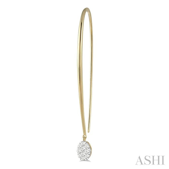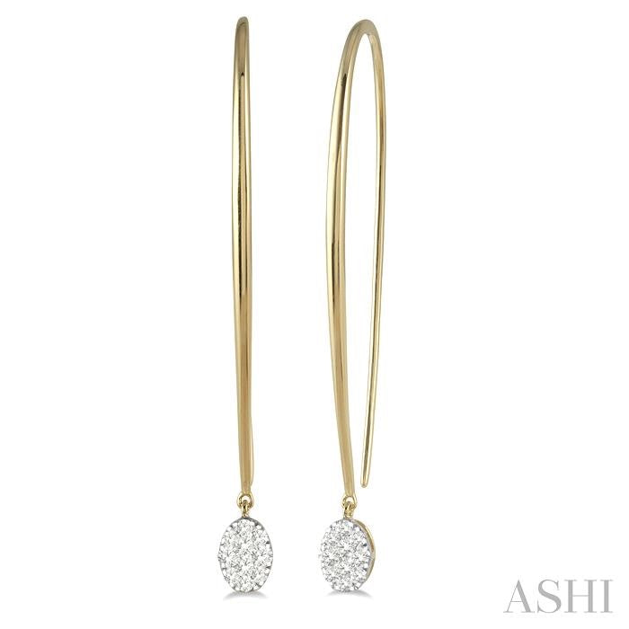 A neat and elegant pair of Lovebright diamond earrings, these make a suitable option for almost any woman. The earring features small oval shape danglers that are encrusted with round cut diamonds. The danglers have a white gold mount that is embellished with 10 invisible set round cut diamonds each. Marquise hooks, which are very easy to wear and comfortable, connect to these danglers to complete the earrings. While the marquise hooks are styled in 14 karat yellow gold, the danglers are in 14 karat yellow and white gold. Total diamond weight is 1/3 ctw. Other metal types & colors may be available.