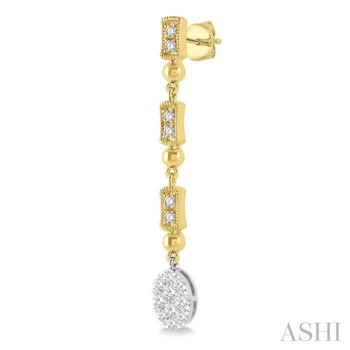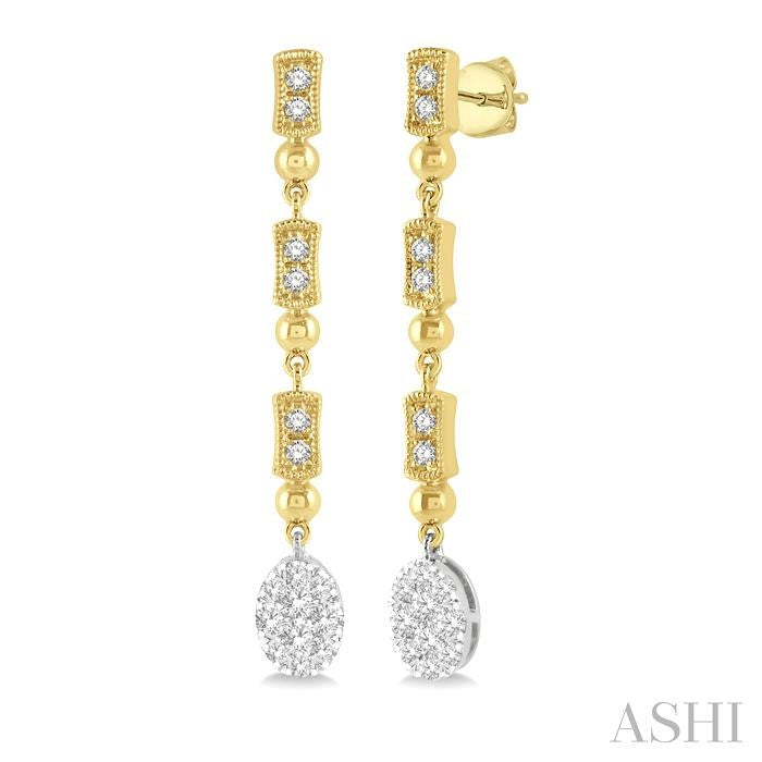 An attractive pair of Lovebright diamond earrings, this makes for an instant choice. It is well-designed and showy like all other jewelry in the Lovebright Collection. The earring displays a white gold oval shape mount, suspended from a row of three connectors, featuring a bar and ball link each. The oval mount is decorated with 10 each invisible set round cut diamonds on either earring. Each of the bar mounts is embellished with 2 each pave set round cut diamonds, a total of 12 diamonds on both earrings. Milgrain borders the bar mounts. The earrings is styled in 14 karat yellow and white gold. Total diamond weight is 5/8 ctw. Other metal types & colors may be available.