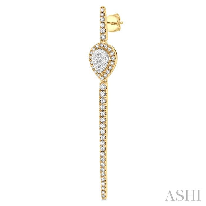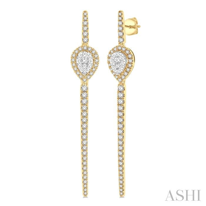 The Lovebright Collection offers a magnetism that draws anyone and everyone to its alluring assemblage. This pair of diamond long earrings comes from the mesmerizing collection. It showcases a long bar with rounded tips, and an pear shape mount at a quarter length from above along the bar. The 2-tiered pear mount features 10 each invisible set round cut diamonds on the raised middle, and 18 each micro wall set round cut diamonds haloing it from the lower tier. 27 each micro wall set round cut diamonds embellish the bar on each earring. There is a total of 110 diamonds on the earring pair, which is styled in 14 karat yellow and white gold. Total diamond weight is 1 ctw. Other metal types & colors may be available.