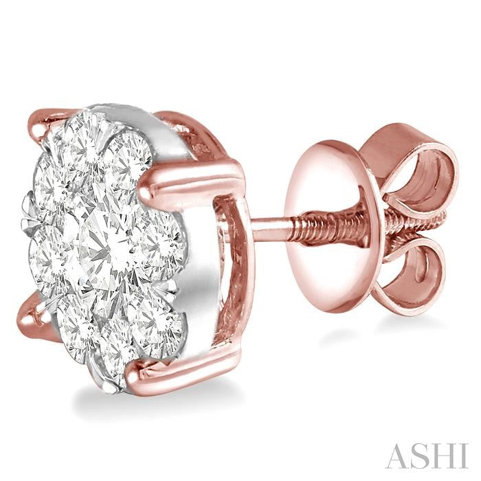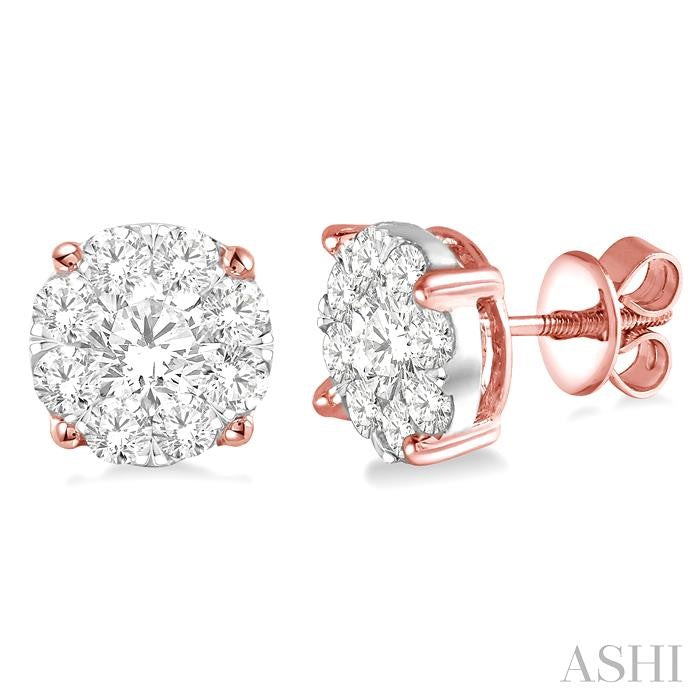 Captivate her with the dazzling and stunning look of these mesmeric lovebright diamond earrings. Beautifully crafted in luminous 14 karat rose and white gold these gorgeous diamond earrings feature 18 round cut diamonds, perfectly invisible set. These earrings close with a secure clasp. Total diamond weight is 2 1/10 ctw. Other metal types & colors may be available.