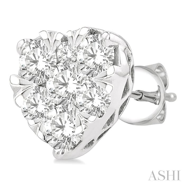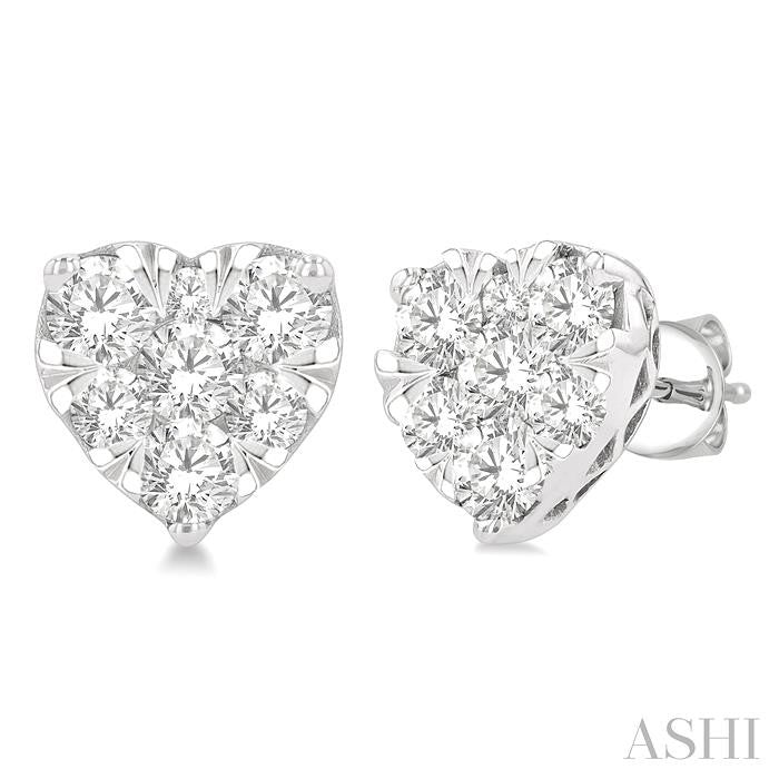 A gorgeous pair of Lovebright diamond stud earrings, these make a perfect piece to include to one's jewelry box. Like all Lovebright jewelry, these earrings also offer glamour and beauty. The earrings are embellished with 14 invisible set round cut diamonds, 7 each on the earring pair. Push-back earnut closures hold the earrings safe and offer easy wear. The Lovebright stud earring is fashioned in a polished rhodium finish 14 karat white gold. Total diamond weight is 1/2 ctw. Other metal types & colors may be available.