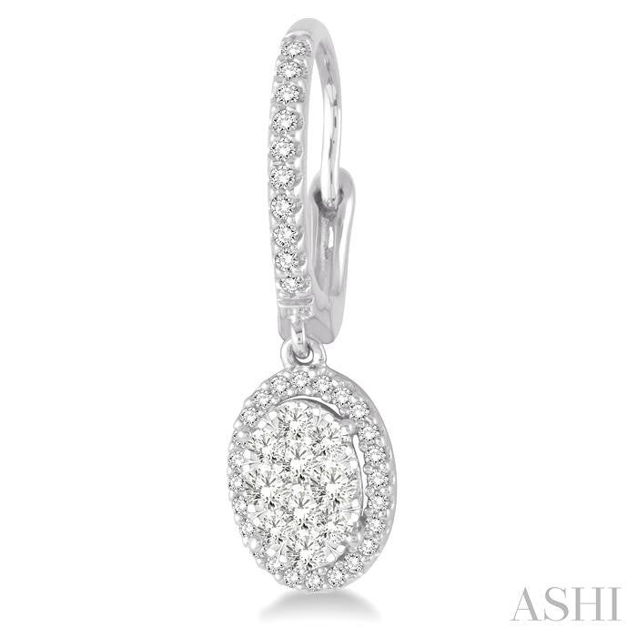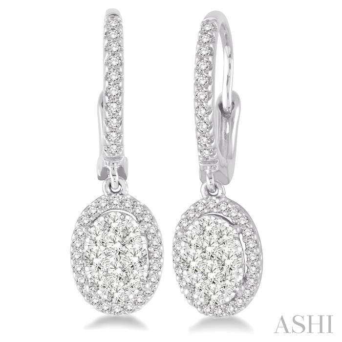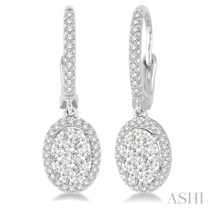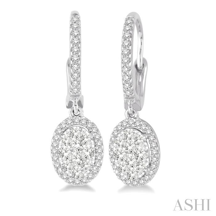 A fun and fanciful designed diamond lovebright earrings for her. Crafted in cool 14 karat white gold, these earring features a set of 20 invisible set round cut diamonds in oval shape bordered with a frame of dazzling 68 prong set round cut diamonds along with the front edge. These treats closes with a secure clasp. Total diamond weight is 5/8 ctw. Other metal types & colors may be available.