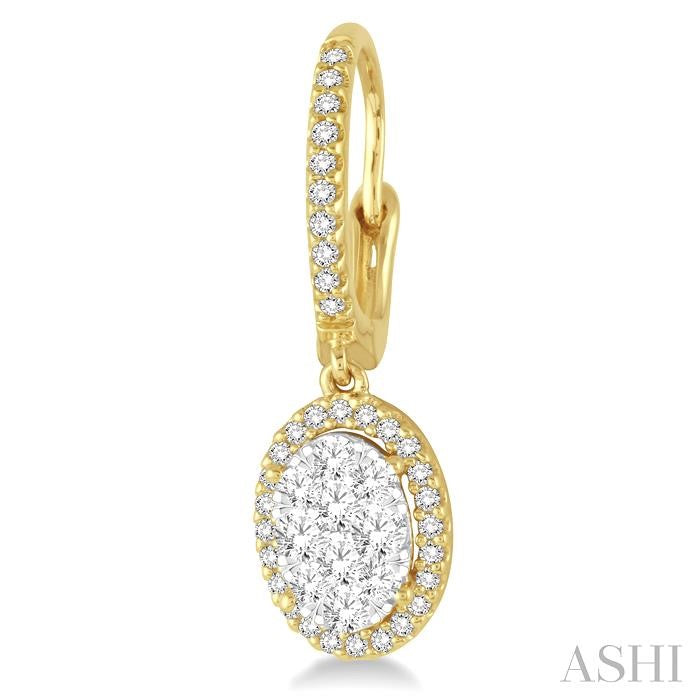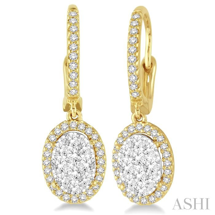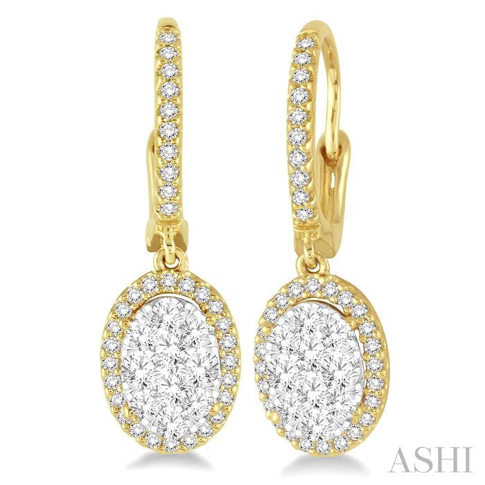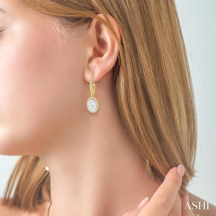 A fun and fanciful designed diamond lovebright earrings for her. Crafted in cool 14 karat yellow and white gold, these earring features an array of 20 invisible set round cut diamonds in oval shape bordered with a frame of dazzling 52 prong set round cut diamonds along with the front edge. These treats closes with a secure clasp. Total diamond weight is 3/4 ctw. Other metal types & colors may be available.