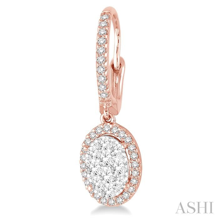 A fun and fanciful designed diamond lovebright earrings for her. Crafted in cool 14 karat rose and white gold, these earring features a set of 20 invisible set round cut diamonds in oval shape bordered with a frame of dazzling 68 prong set round cut diamonds along with the front edge. These treats closes with a secure clasp. Total diamond weight is 5/8 ctw. Other metal types & colors may be available.