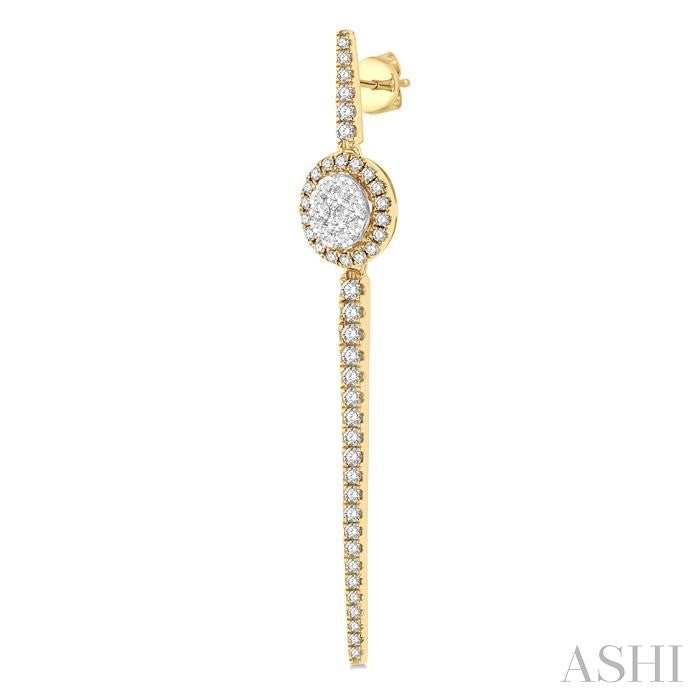 The Lovebright Collection offers a magnetism that draws anyone and everyone to its alluring assemblage. This pair of diamond long earrings comes from the mesmerizing collection. It showcases a long bar with rounded tips, and an oval shape mount at a quarter length from above along the bar. The 2-tiered oval mount features 10 each invisible set round cut diamonds on the raised middle, and 18 each micro wall set round cut diamonds haloing it from the lower tier. 27 each micro wall set round cut diamonds embellish the bar on each earring. There is a total of 110 diamonds on the earring pair, which is styled in 14 karat yellow and white gold. Total diamond weight is 1 ctw. Other metal types & colors may be available.