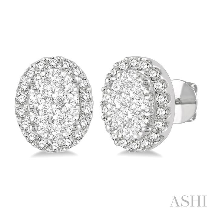 A classy pair of Lovebright diamond stud earrings; these offer a charming visual appeal. The studs feature a mildly raised oval mount in the center with an oval shape border surrounding it from the base. Both inner mount and outer border are embellished with round cut diamonds. A cluster of invisible set round cut diamonds, 20 on both earrings, in four different sizes decorate the oval center mount. The bordering mount is encrusted with a total of 36 pave set round cut diamonds on both earrings. Simple push back clasps secure the earrings, which are styled in 14 karat white gold. Total diamond weight is 1/2 ctw. Other metal types & colors may be available.