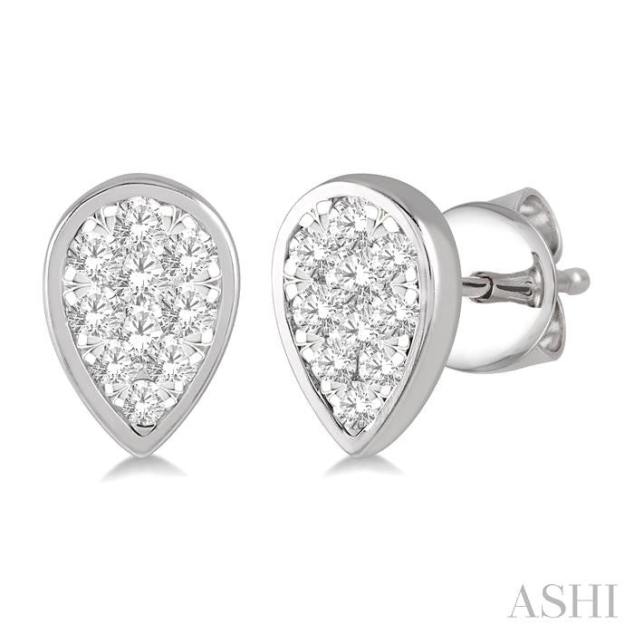 Enhance your everyday elegance with these beautiful Lovebright Petite diamond fashion stud earrings that can add a touch of luxury to any outfit. Featuring a captivating pear-shaped mount, these earrings shine brilliantly with their cluster of round cut diamonds. Each mount is adorned with 10 meticulously invisible-set round cut diamonds, creating a mesmerizing sparkle that draws the eye. Crafted in a rhodium finish 10 karat white gold, these Lovebright Petite diamond fashion stud earrings effortlessly blend timeless charm with contemporary sophistication. Total diamond weight of 1/6 ctw. Other metal types & colors may be available.