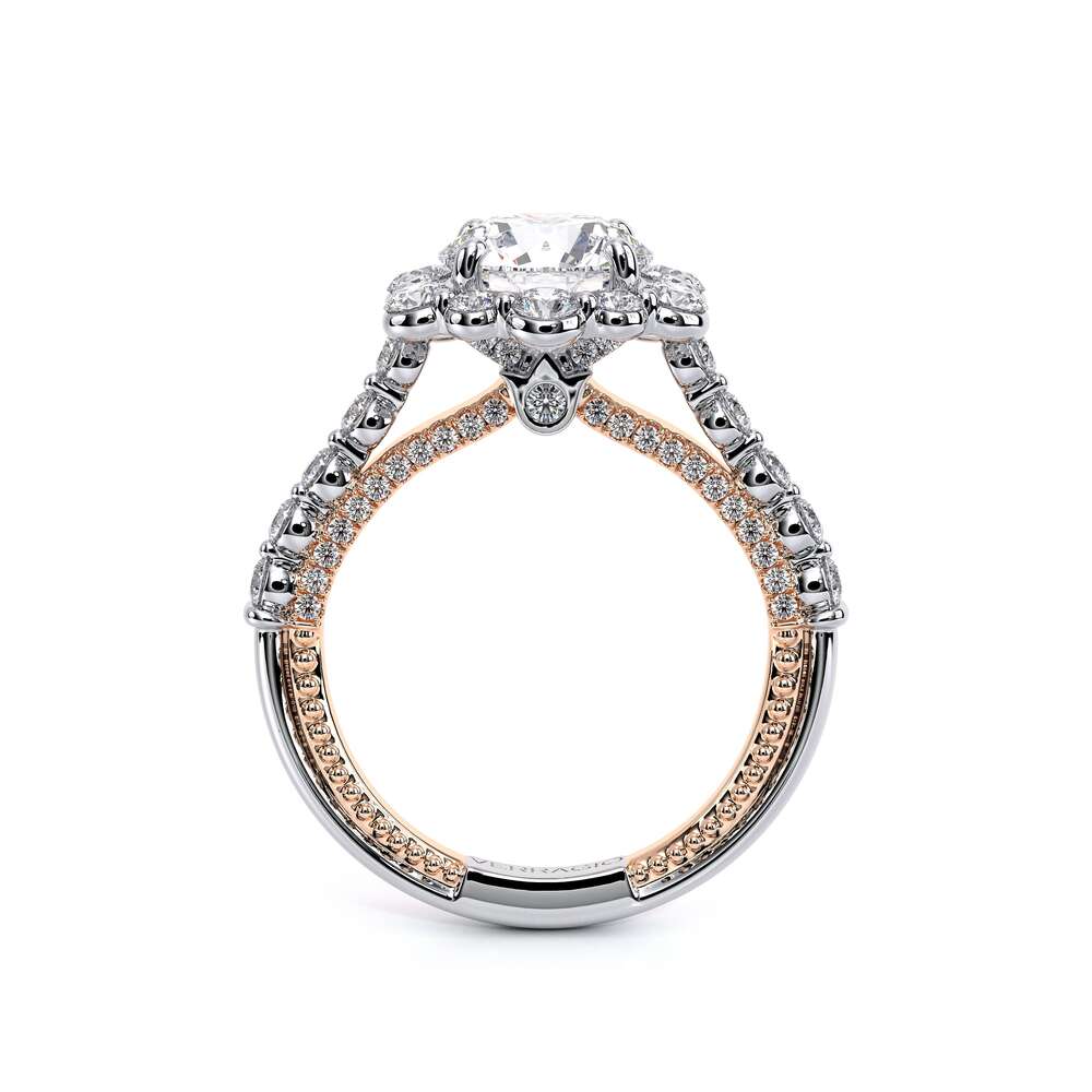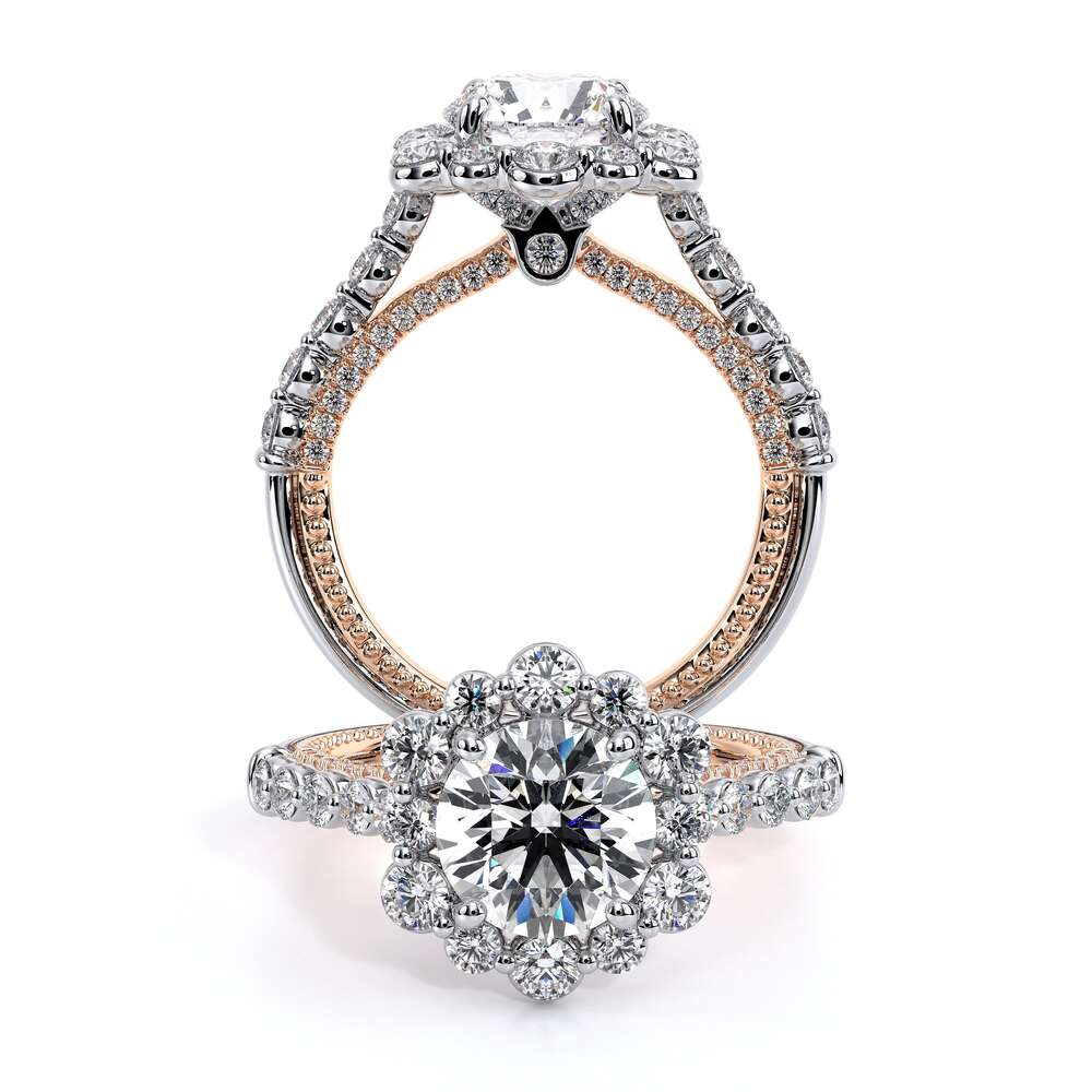 COUTURE-0444R One of a Kind Double Floret Engagement ring that features a pave set cathedral diamond band, the subtle sparkle of our half diamond Riviera, adorned with the Verragio Crest and our Verragio Signature Beading, completed with the Couture shank.