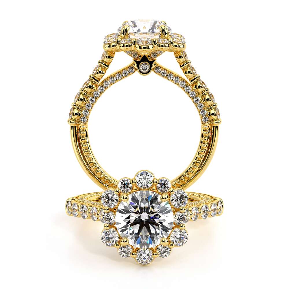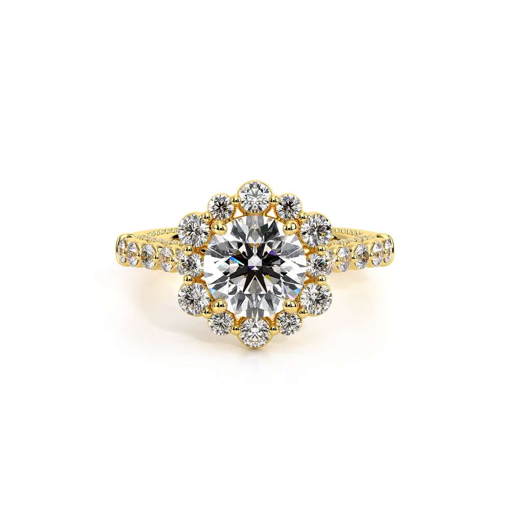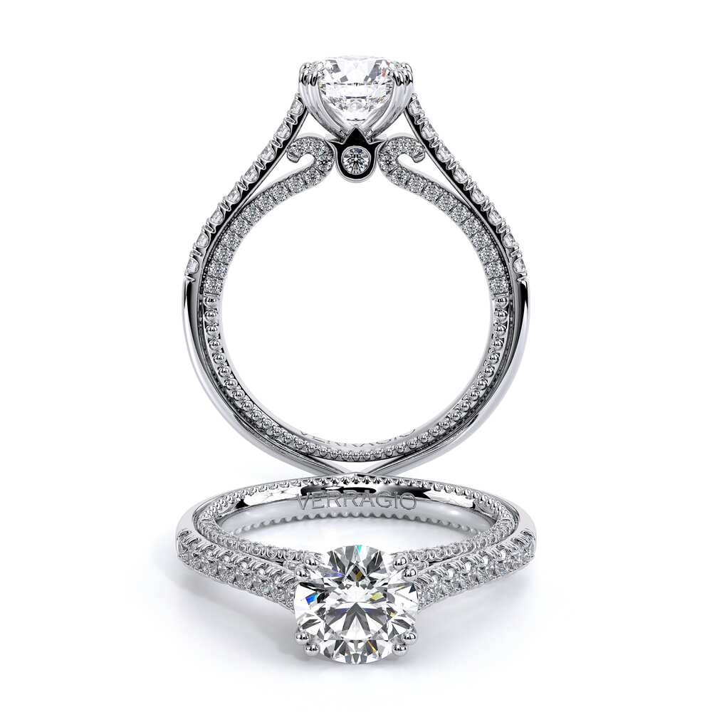 COUTURE-0418R Round Classic Solitaire Engagement ring with simple Double Claw Prongs, featuring the Verragio Crest and upward Scrollwork Signature Beading profile, completed with the Couture pointed shank.