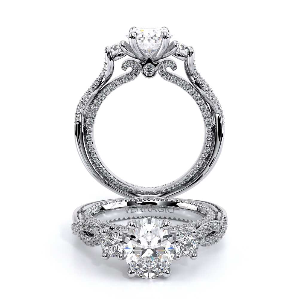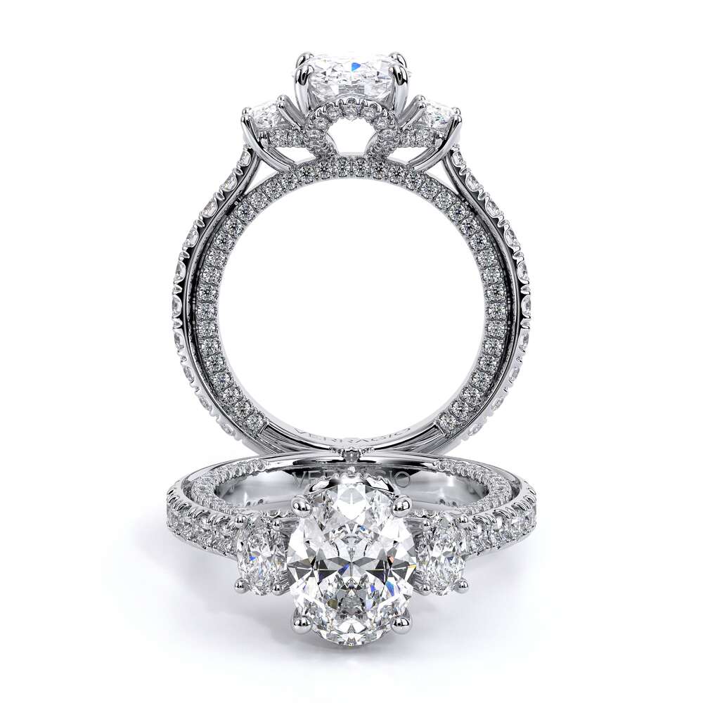 COUTURE-0470PS Beautiful Oval three stone Engagement ring pave set with round brilliant diamonds, adorning the Verragio Crest and half Diamond Riviera along with our Verragio Signature Beading profile, completed with the Couture shank.