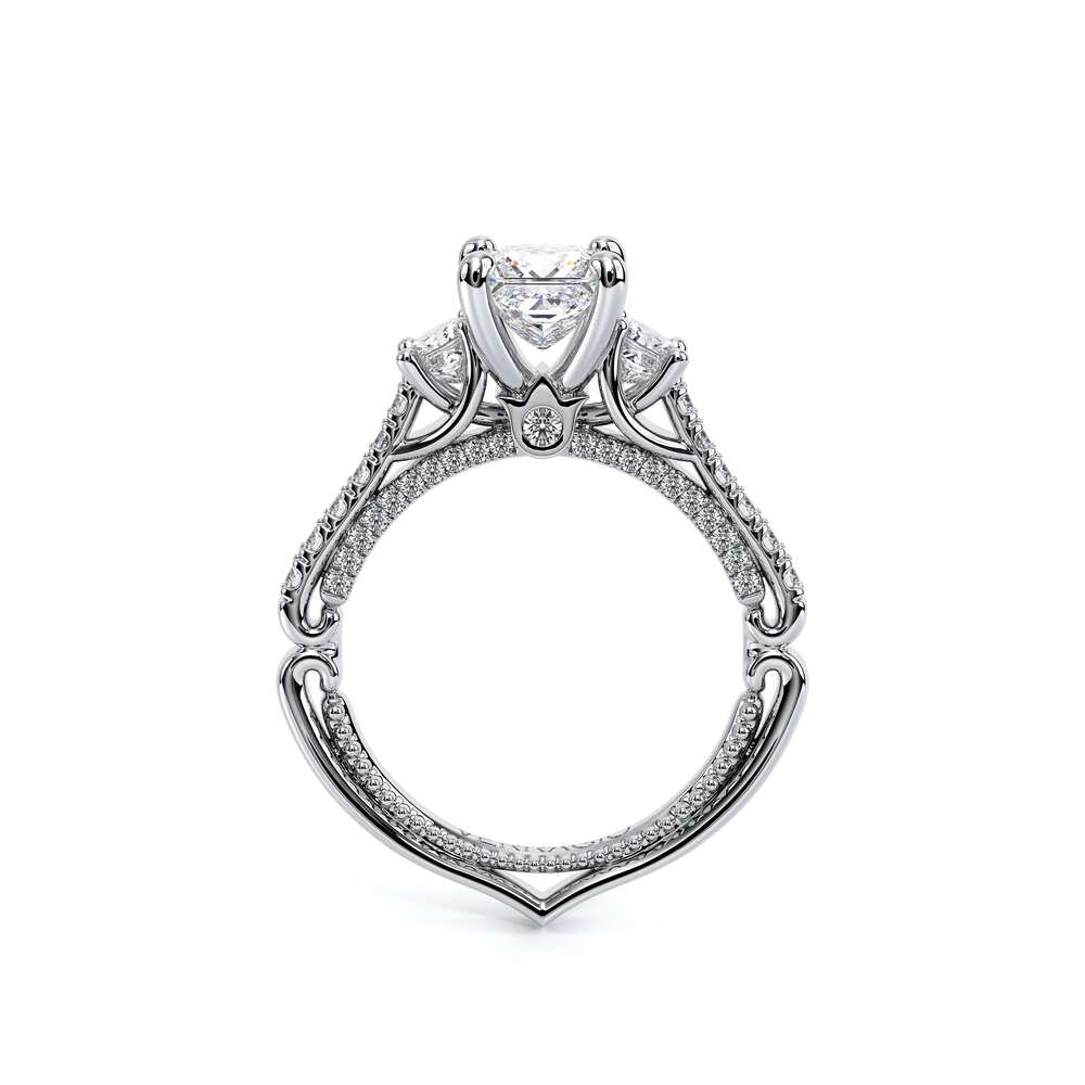 COUTURE-0418P Princess Solitaire Engagement ring featuring the Verragio Crest-Bezel set and upward Scrollwork Signature Beading profile, completed with the Couture pointed shank.