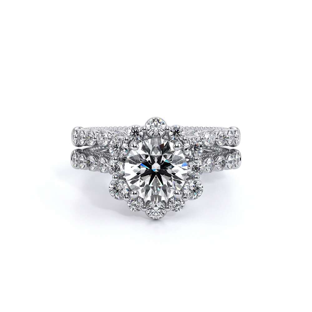 COUTURE-0480R Features, bezel set brilliant-cut diamonds on our new Amore halo with meticulously set diamonds on a straight band. All details are elevated with the addition of our 1/2 Diamonds Riviera with Verragio's timeless signature crest and beading.