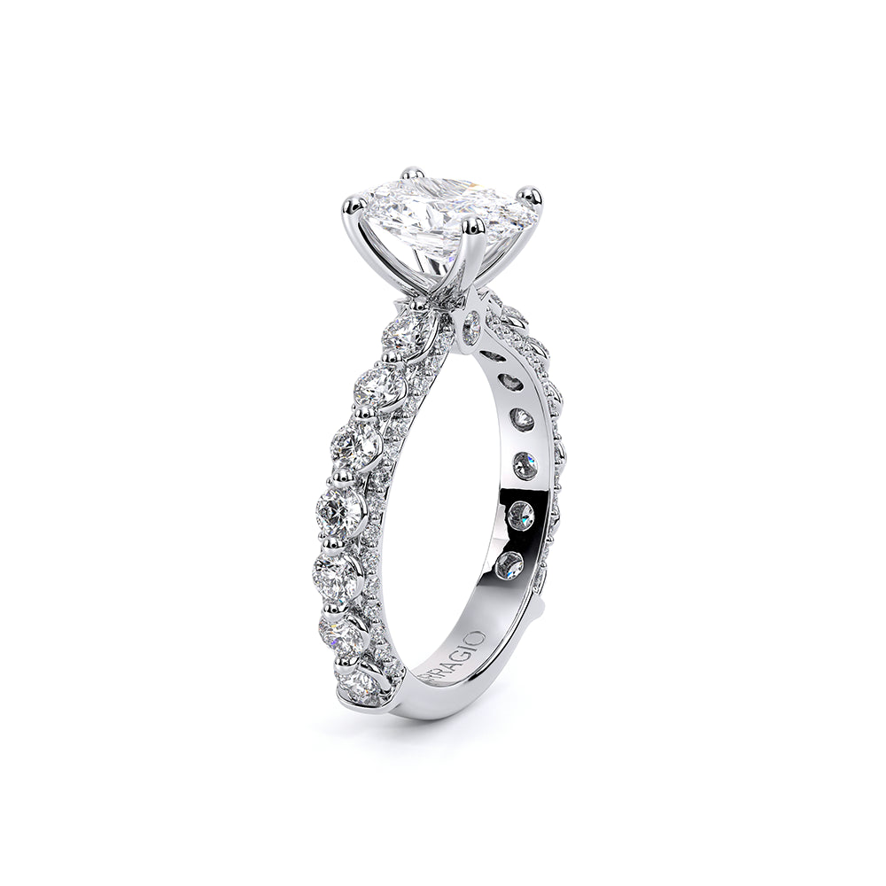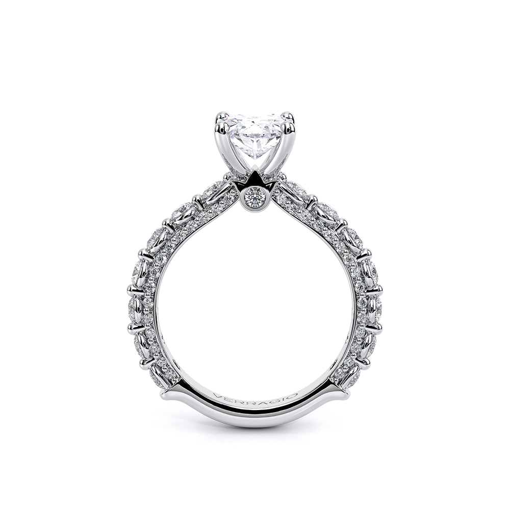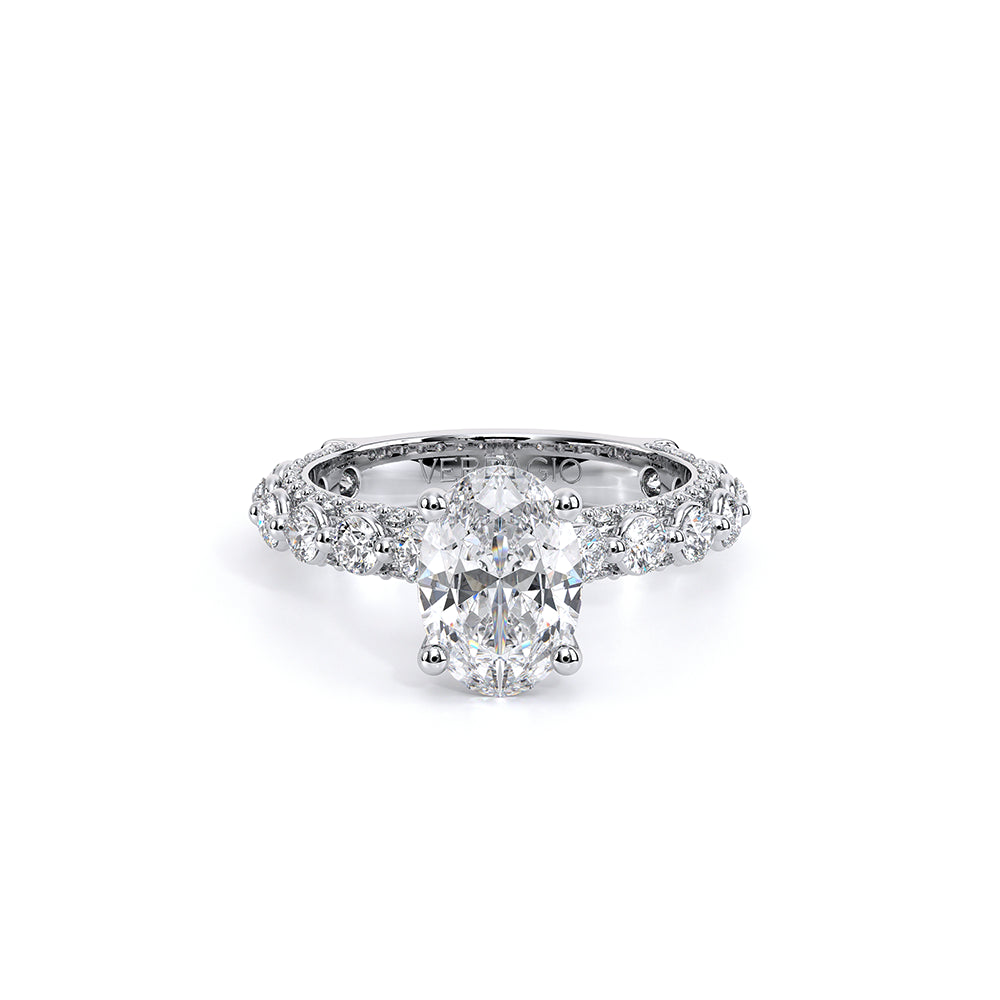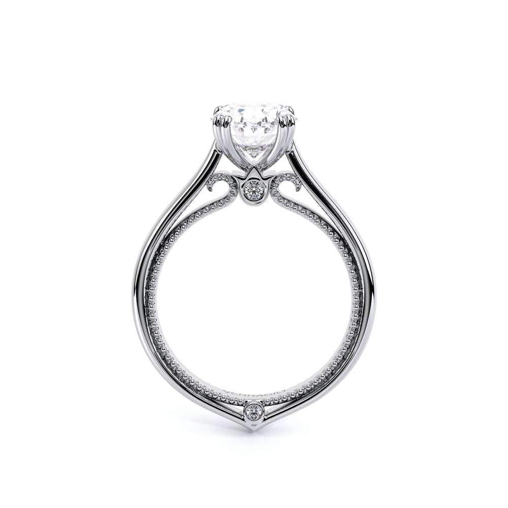 COUTURE-0418OV Oval Solitaire Engagement ring featuring the Verragio Crest-Bezel set and upward Scrollwork Signature Beading profile, completed with the Couture pointed shank.