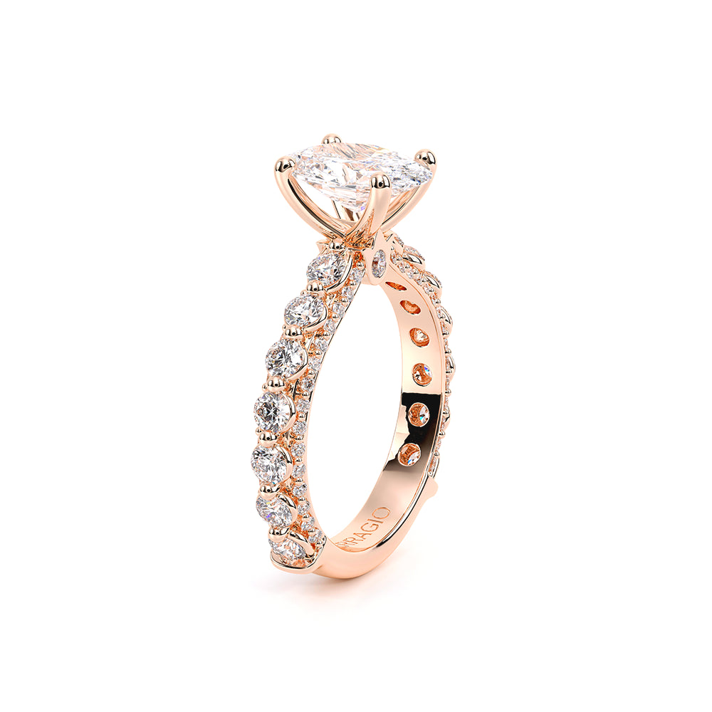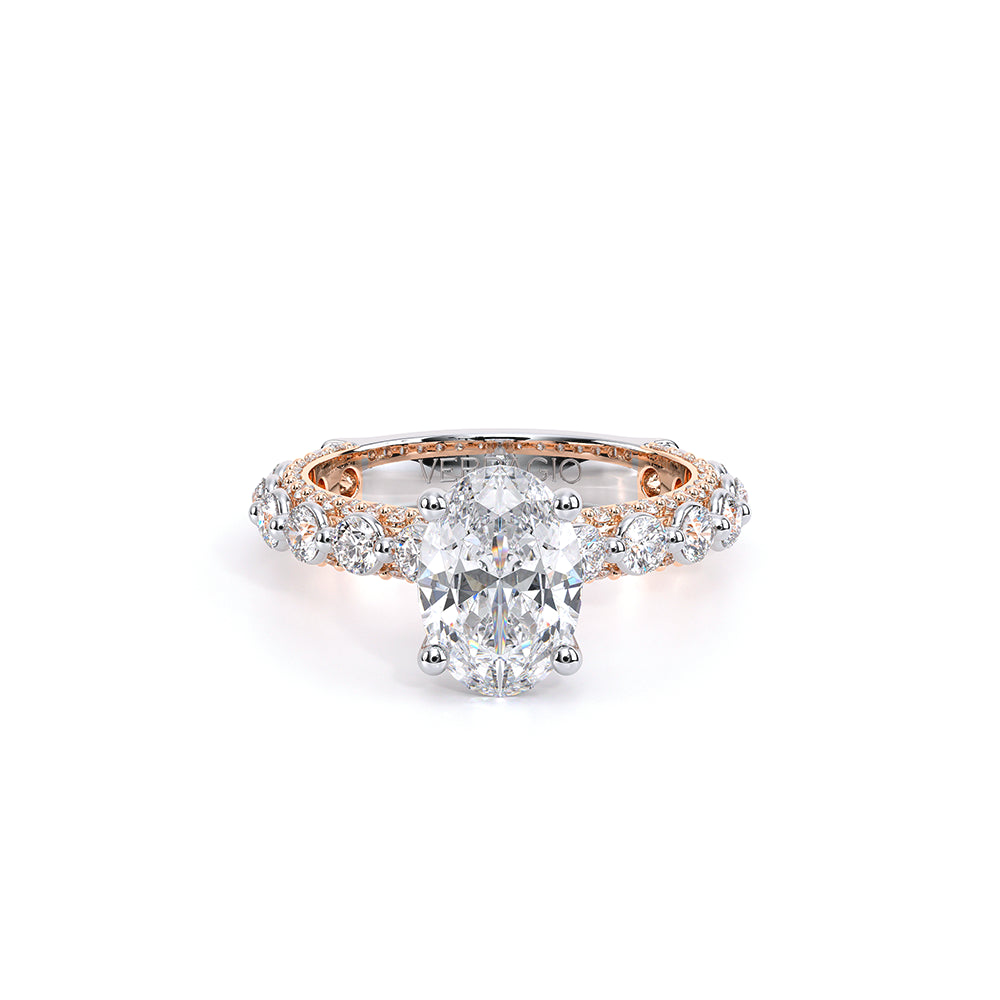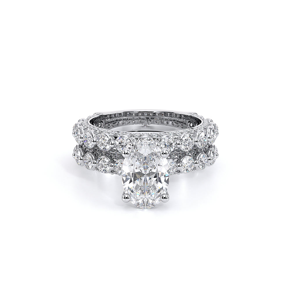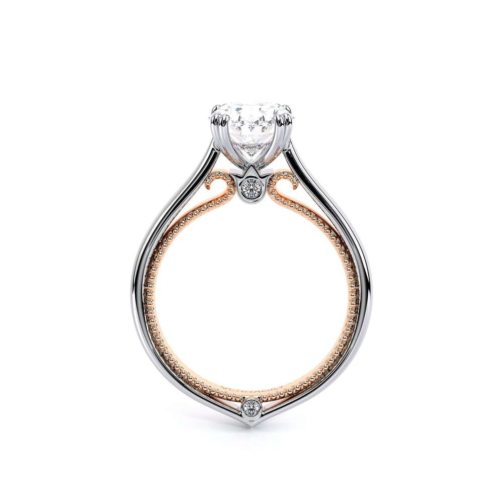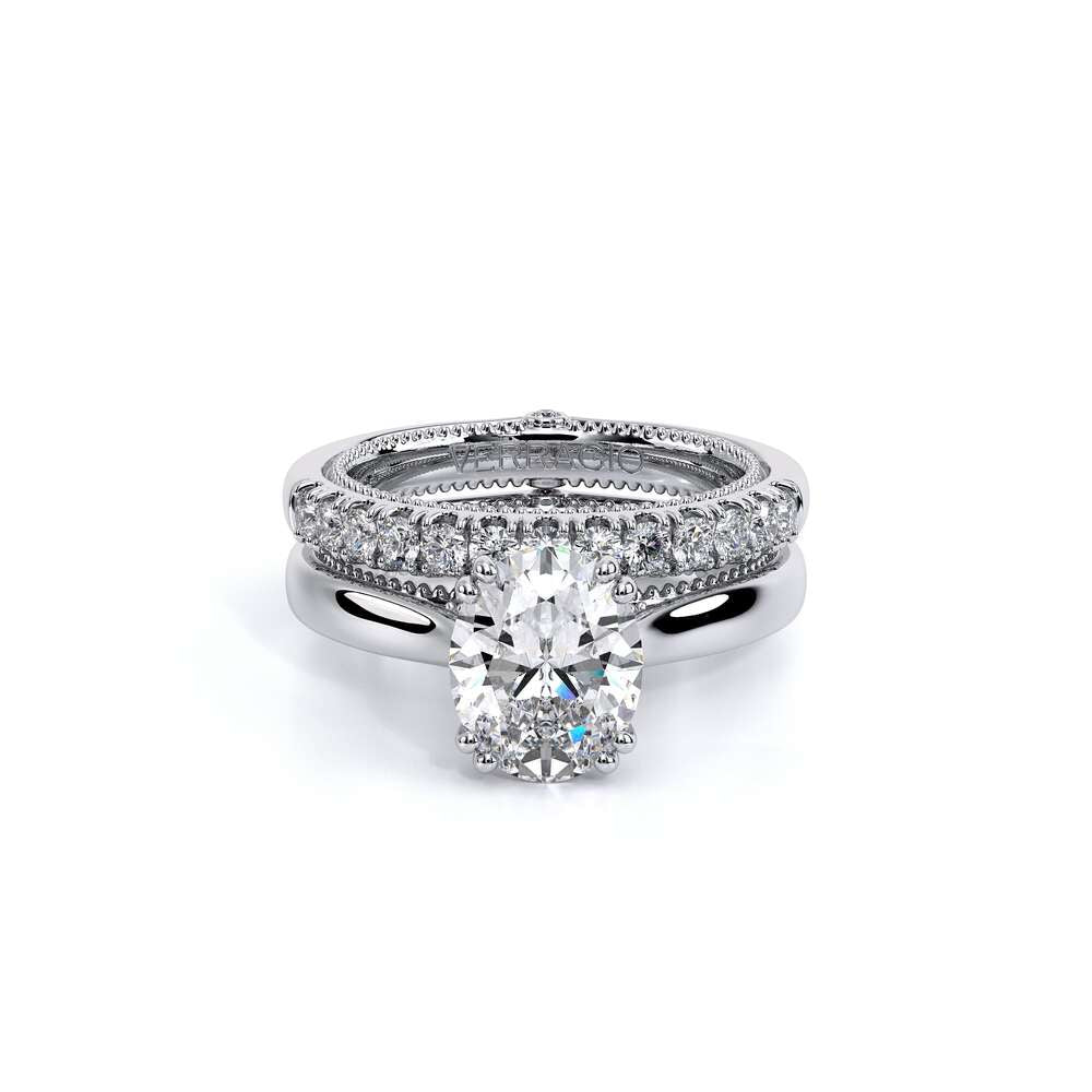COUTURE-0418OV Oval Solitaire Engagement ring featuring the Verragio Crest-Bezel set and upward Scrollwork Signature Beading profile, completed with the Couture pointed shank.