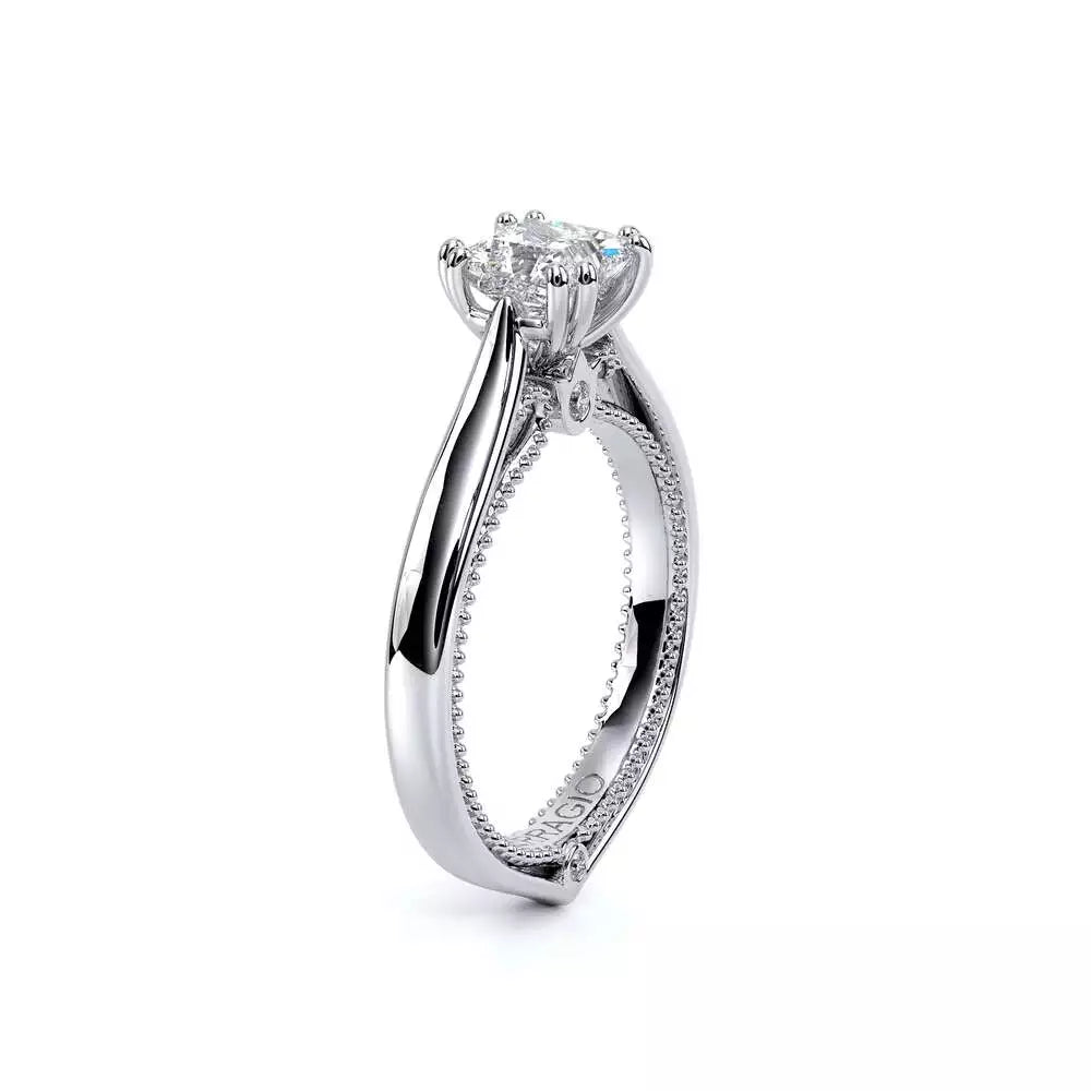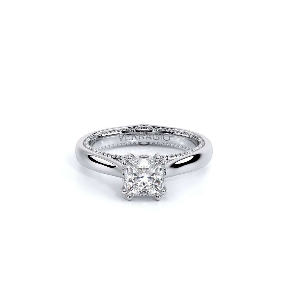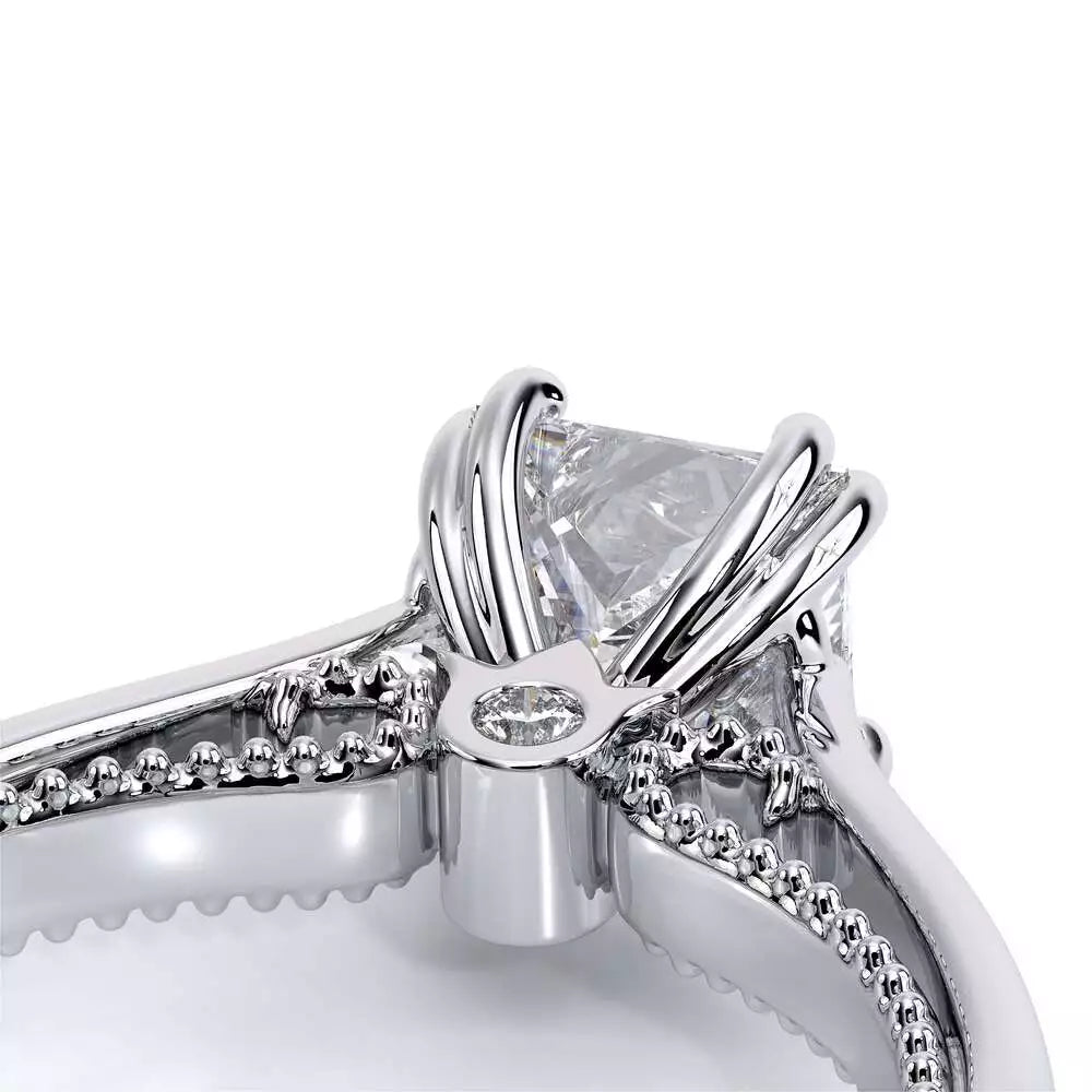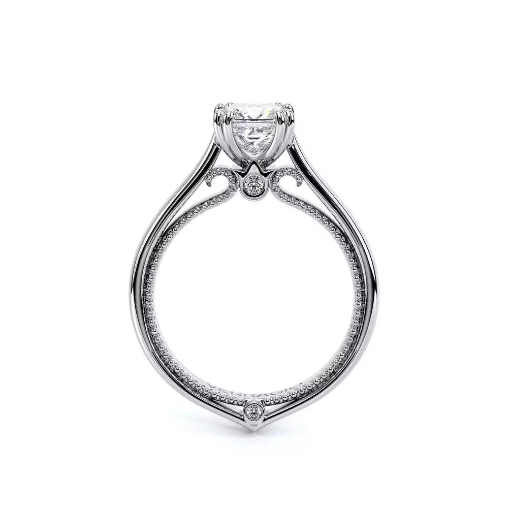 COUTURE-0418P Princess Solitaire Engagement ring featuring the Verragio Crest-Bezel set and upward Scrollwork Signature Beading profile, completed with the Couture pointed shank.