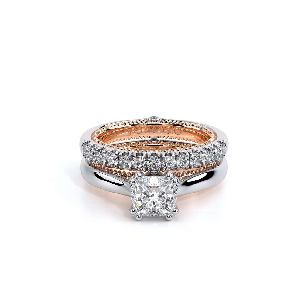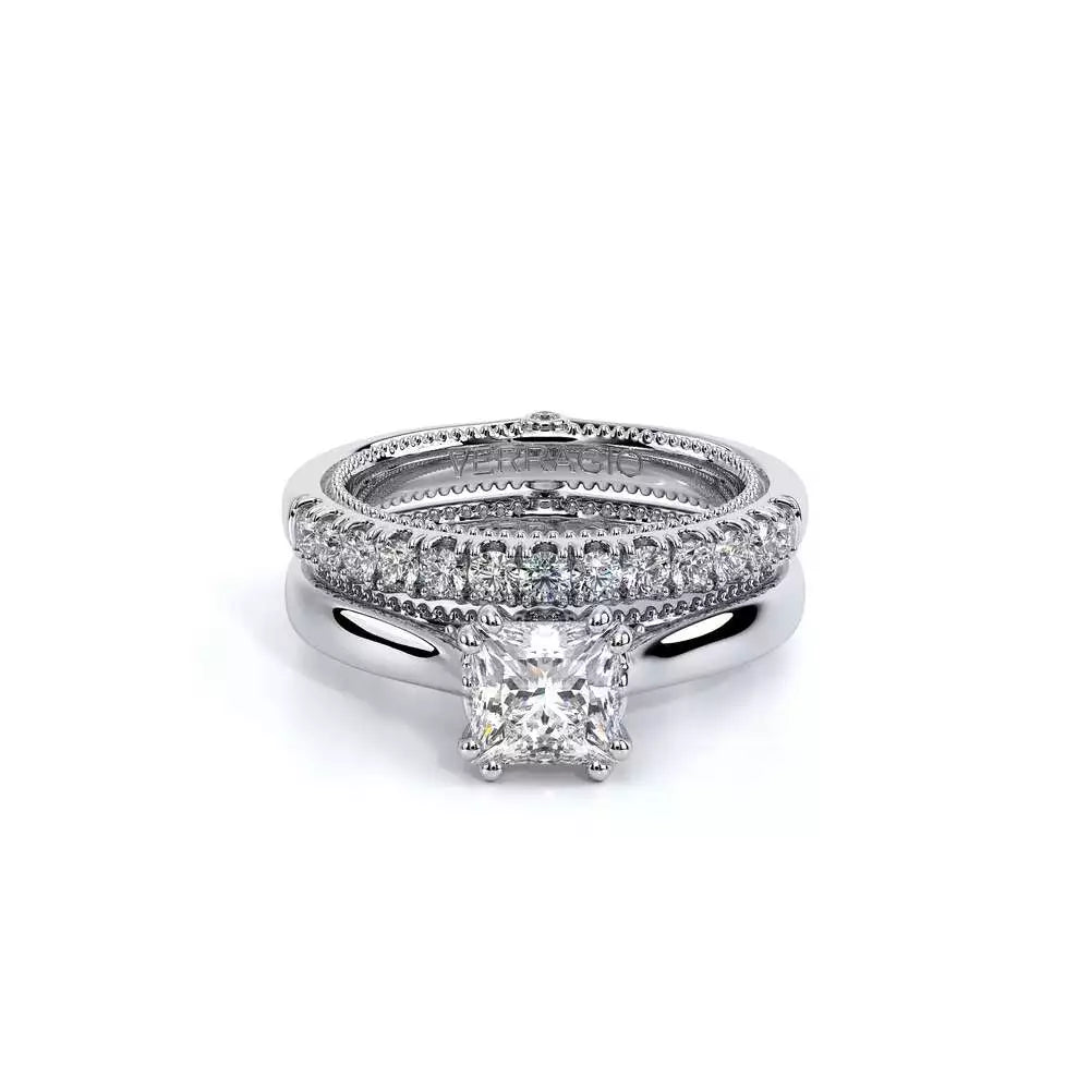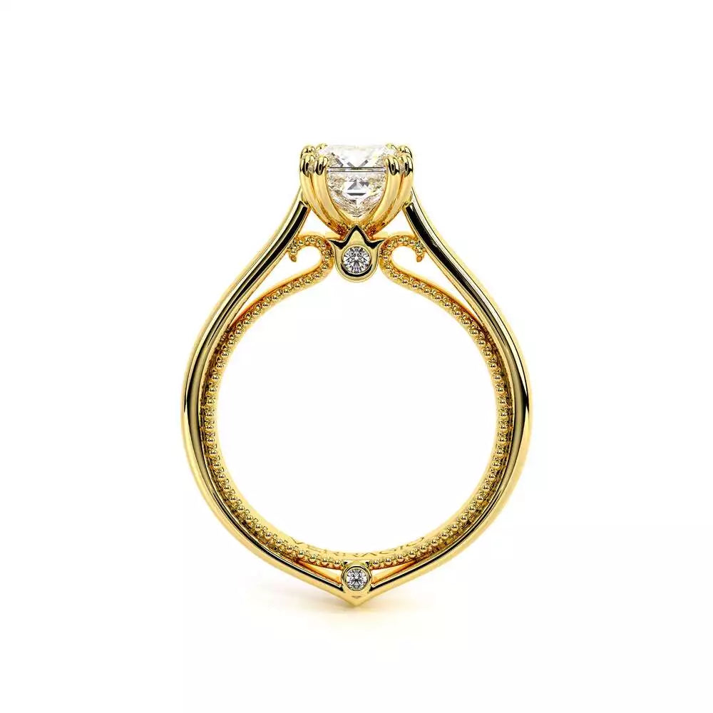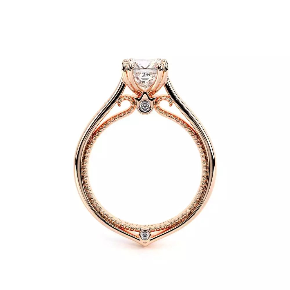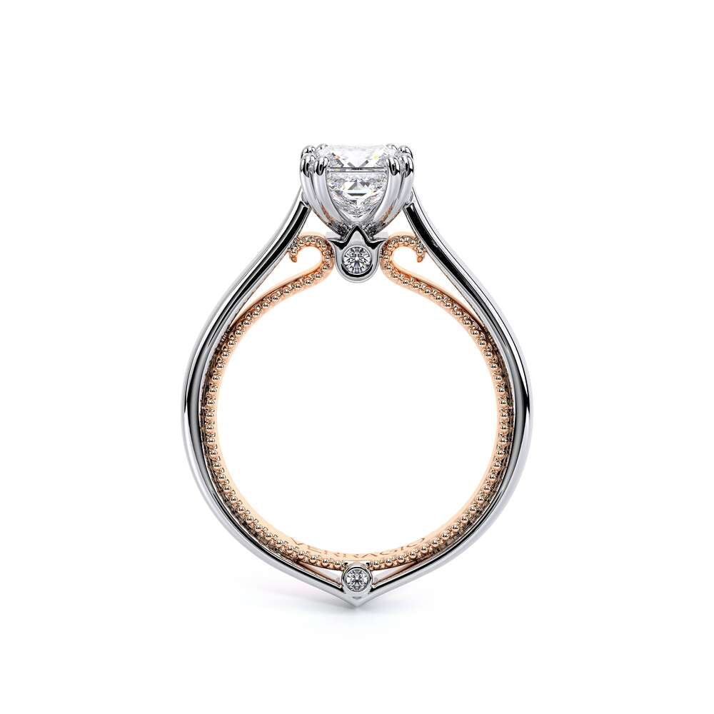 COUTURE-0418P Princess Solitaire Engagement ring featuring the Verragio Crest-Bezel set and upward Scrollwork Signature Beading profile, completed with the Couture pointed shank.