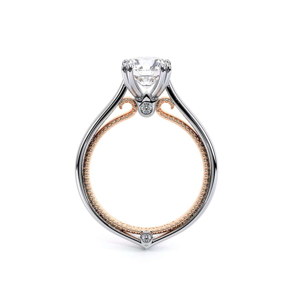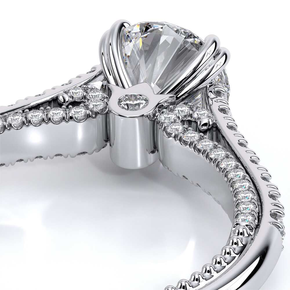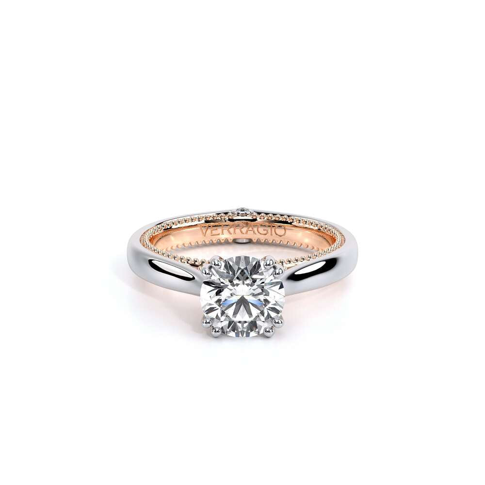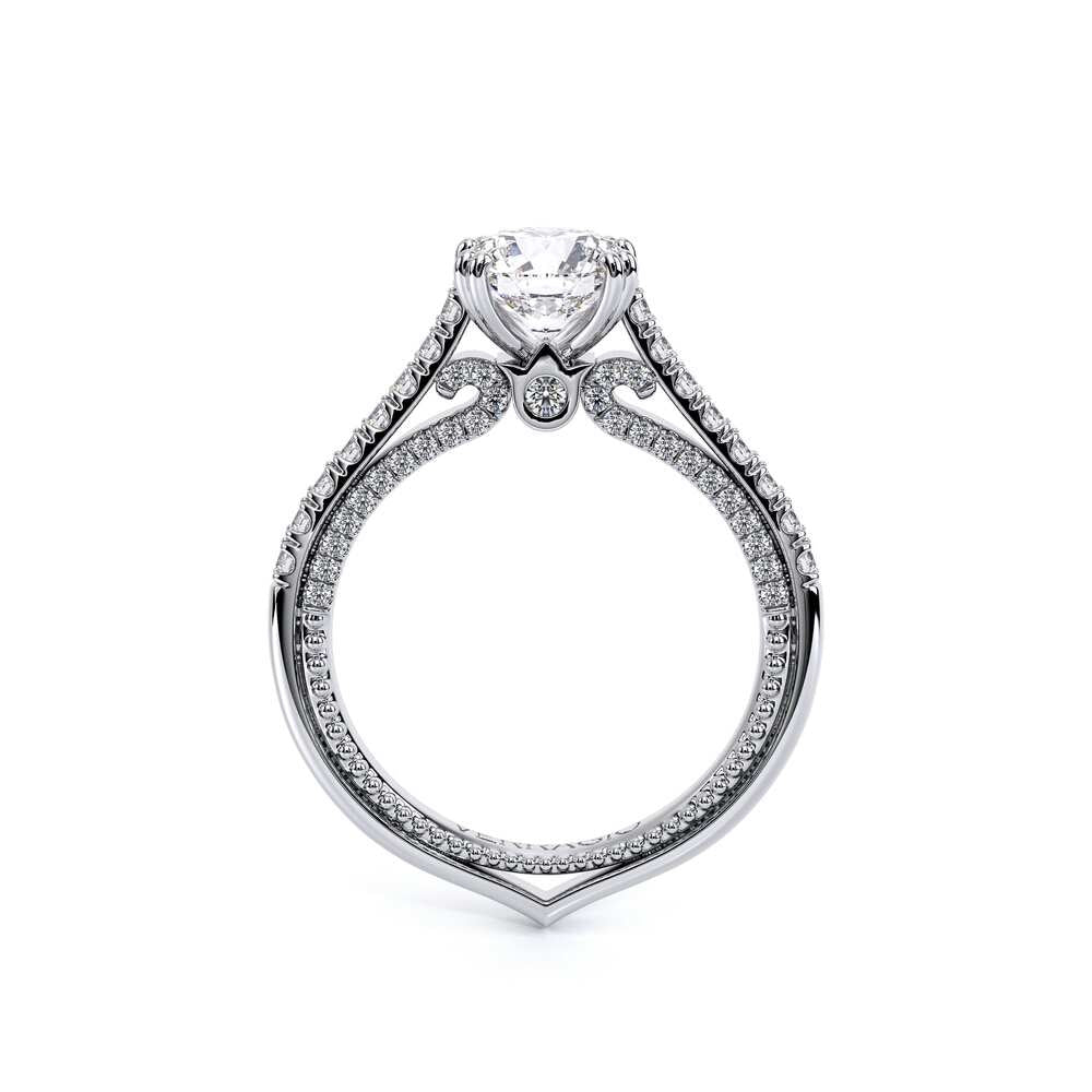 COUTURE-0418R Round Classic Solitaire Engagement ring with simple Double Claw Prongs, featuring the Verragio Crest and upward Scrollwork Signature Beading profile, completed with the Couture pointed shank.