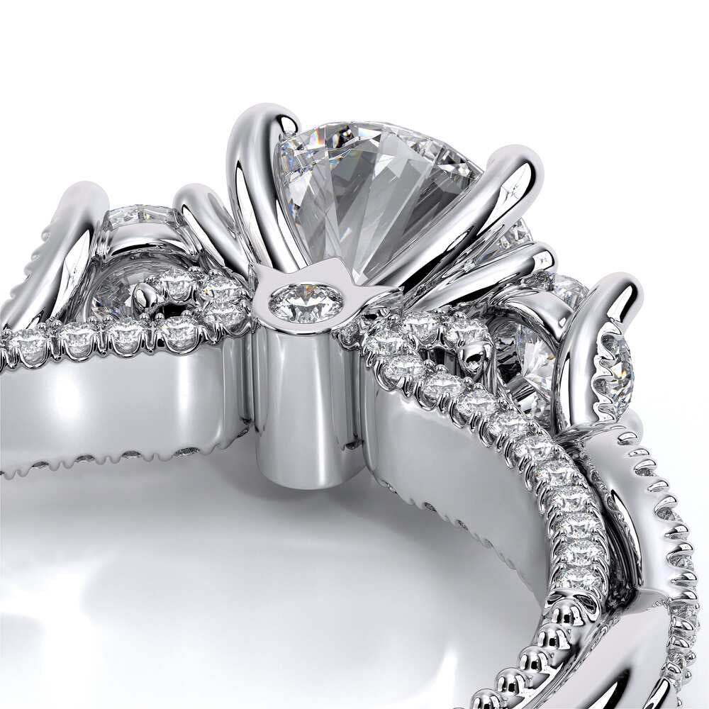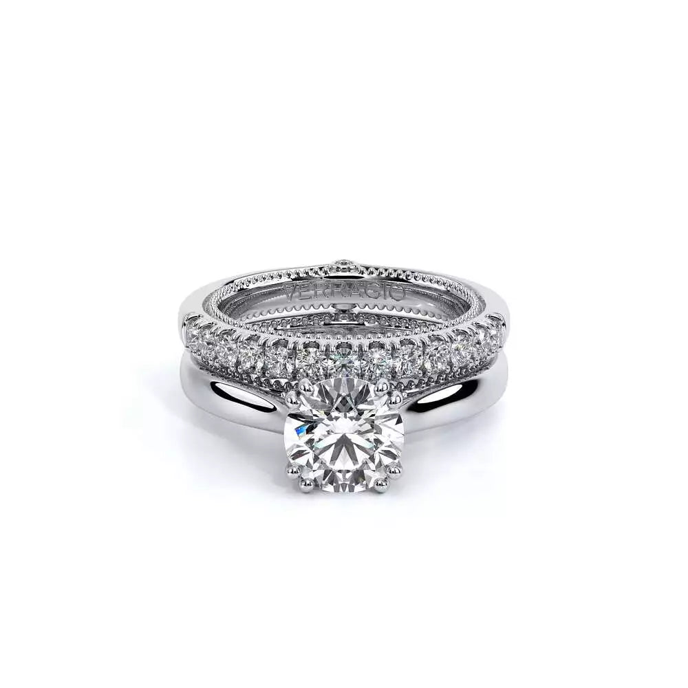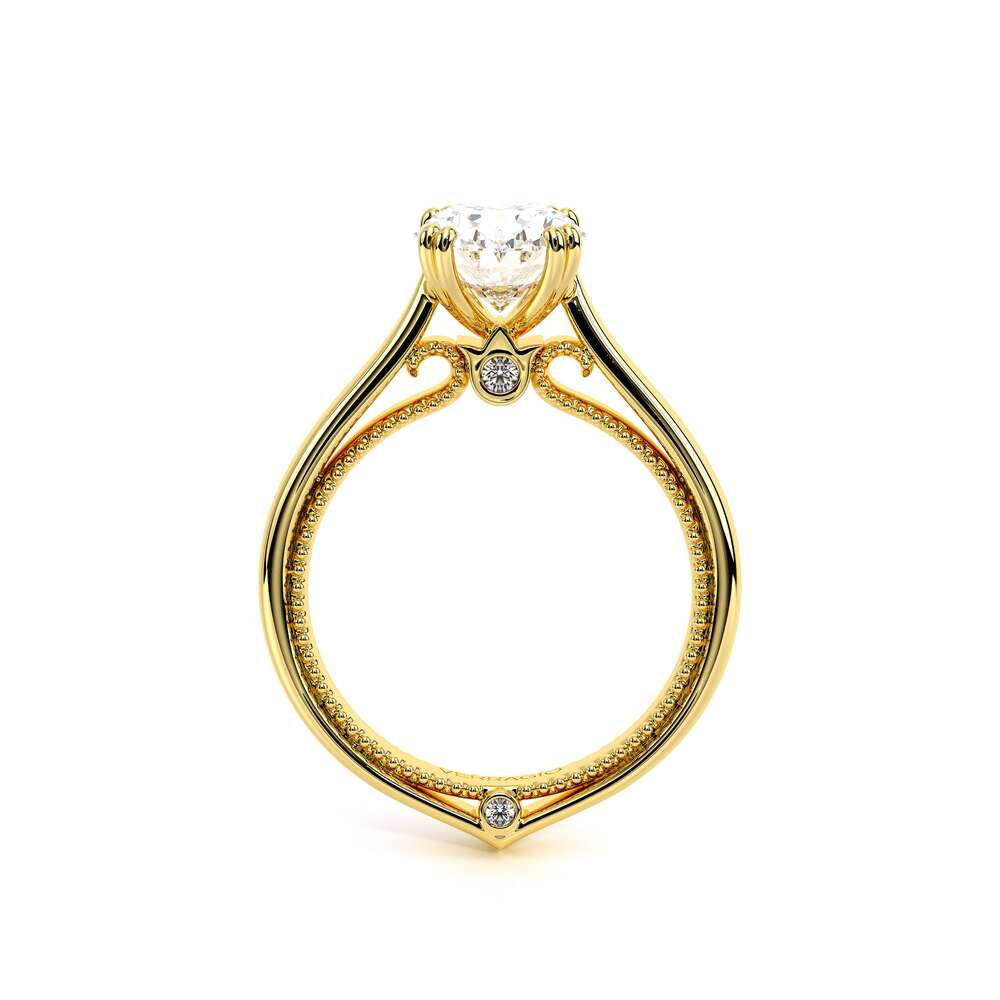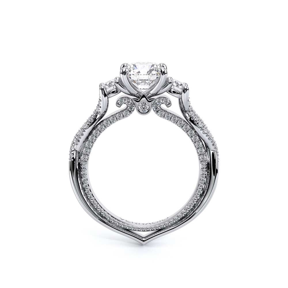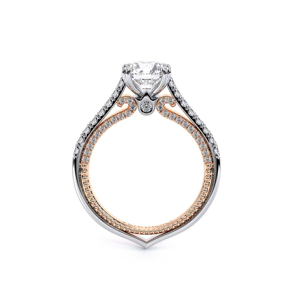 COUTURE-0418R Round Classic Solitaire Engagement ring with simple Double Claw Prongs, featuring the Verragio Crest and upward Scrollwork Signature Beading profile, completed with the Couture pointed shank.