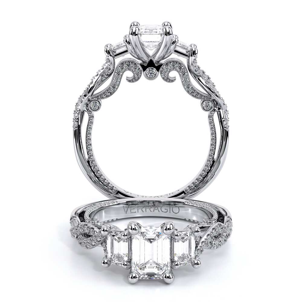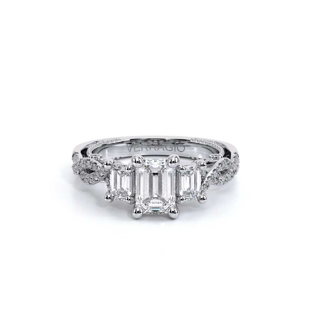 INSIGNIA-7074EM Three stone diamond engagement ring adorned with Verragio's signature beading, pave set brilliant-cut diamonds on Insignia's handcrafted scrollwork and twisted band. Refined to enhance a Emerald diamond center.
