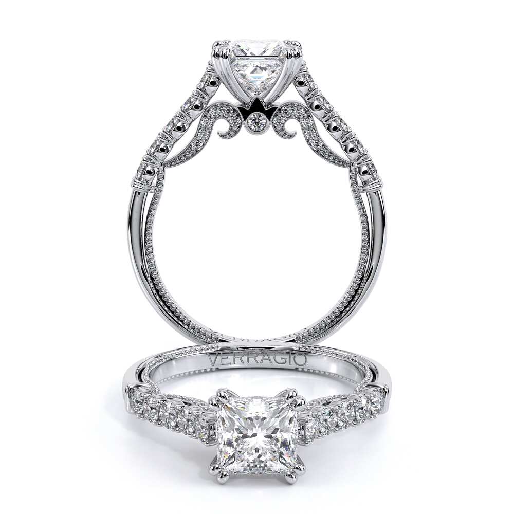 INSIGNIA-7100P Accentuates your Princess engagement ring with a pave set stardust halo illuminated by round brilliant-cut diamonds. Featuring, a shared-prong set band and handcrafted Insignia's scrollwork. Refined by Verragio's signature beading and crest.