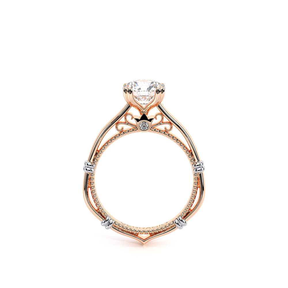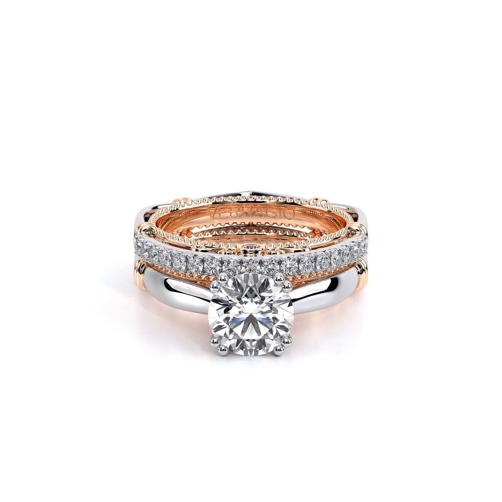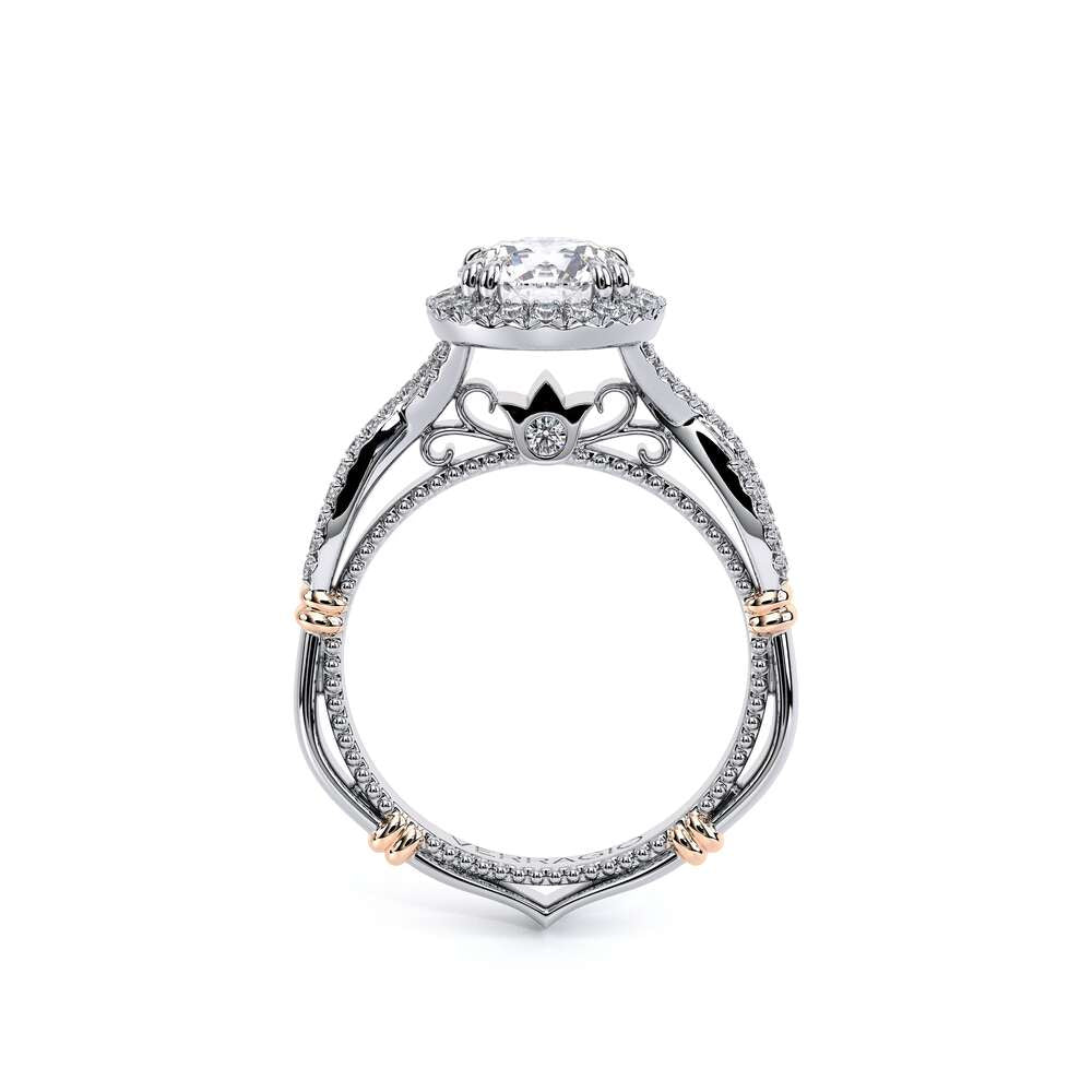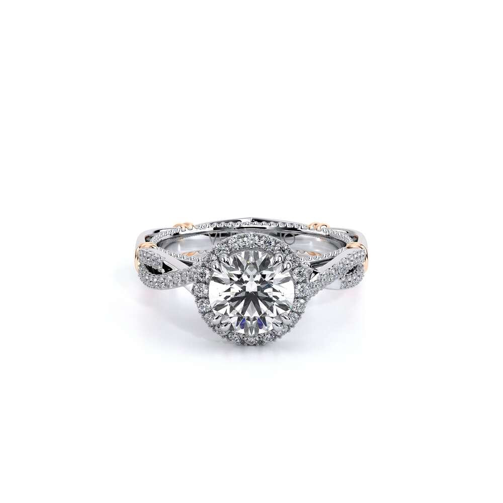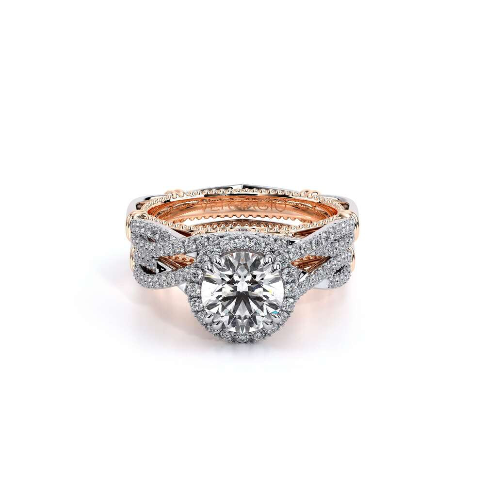 Parisian-106R is a classic engagement ring that features pave set twisted diamond band with a brilliant round halo, Parisian Lace detail, our Verragio signature beading and lastly adorned with rose gold Timeless wraps.
