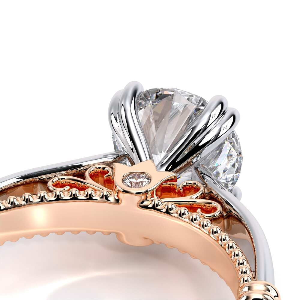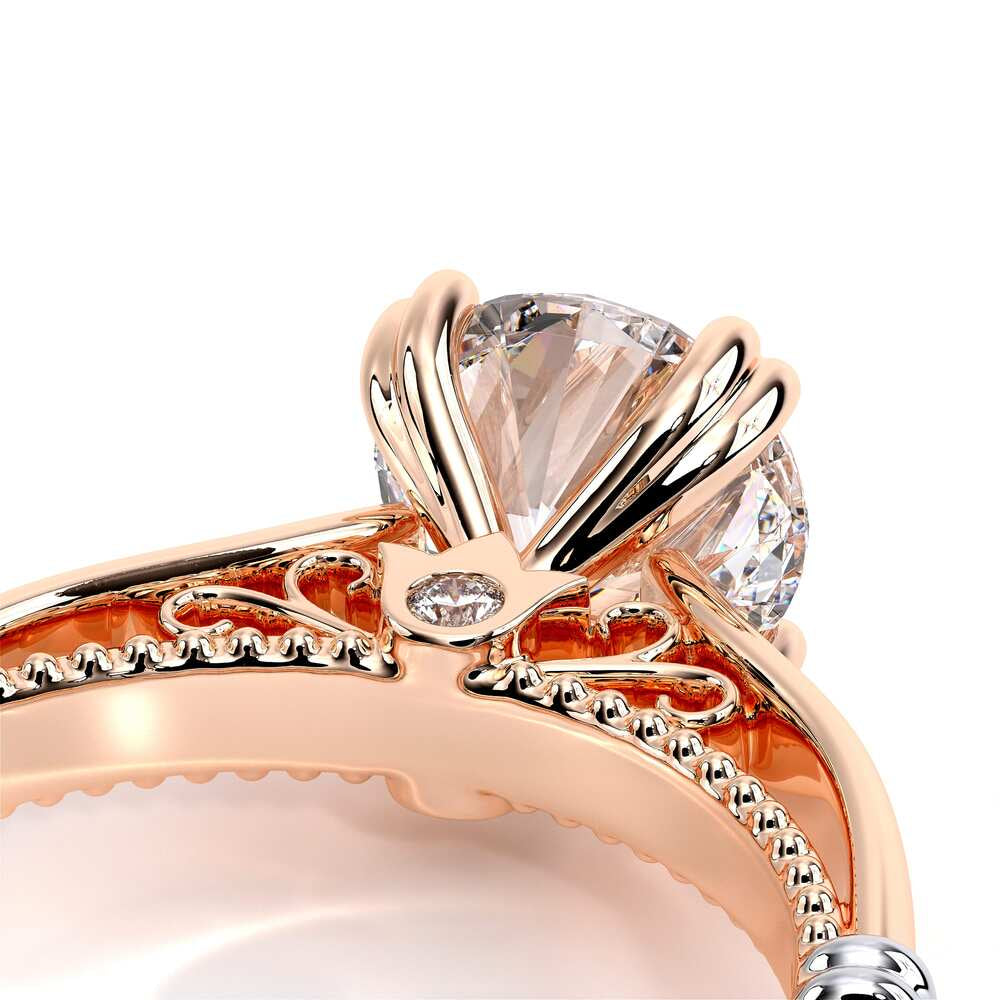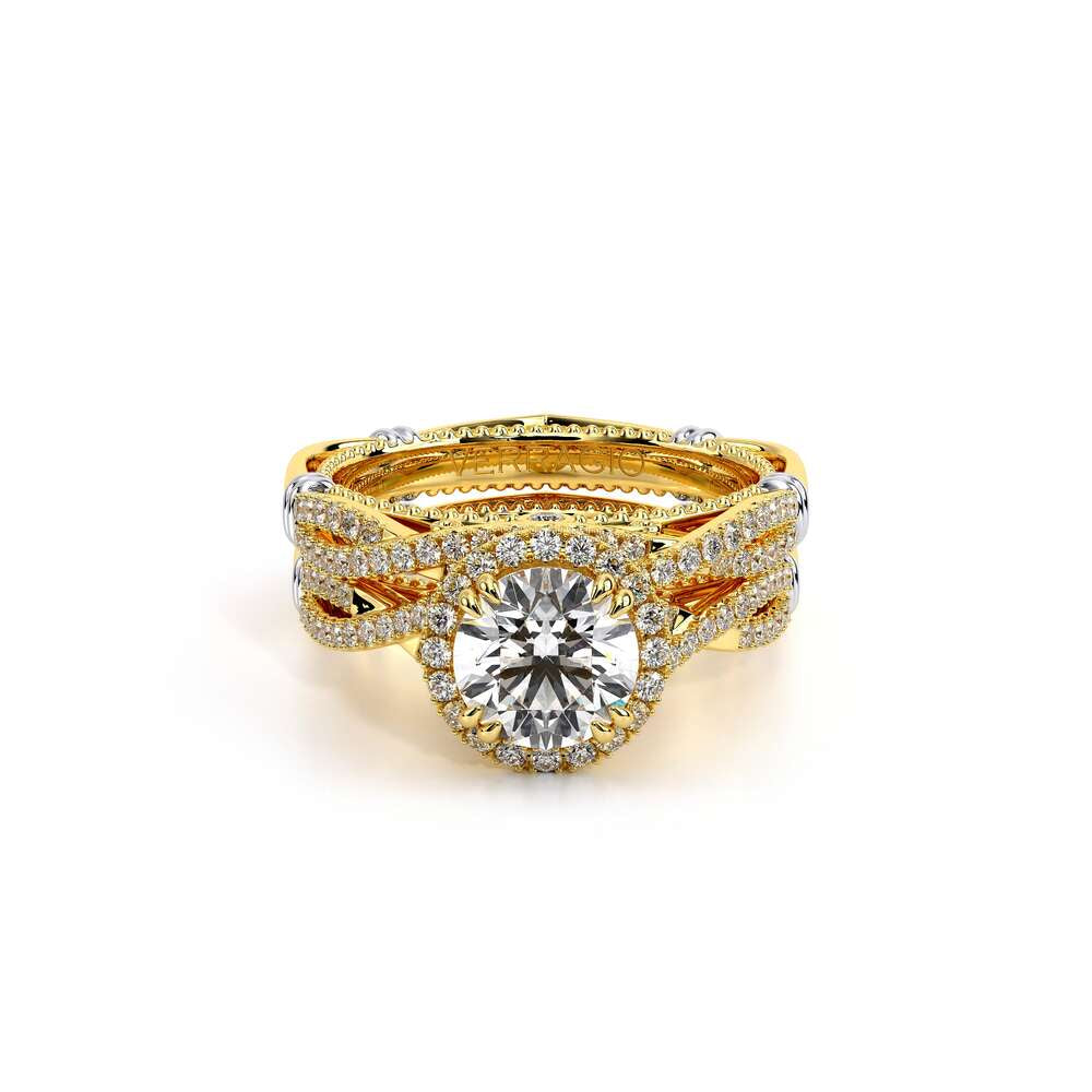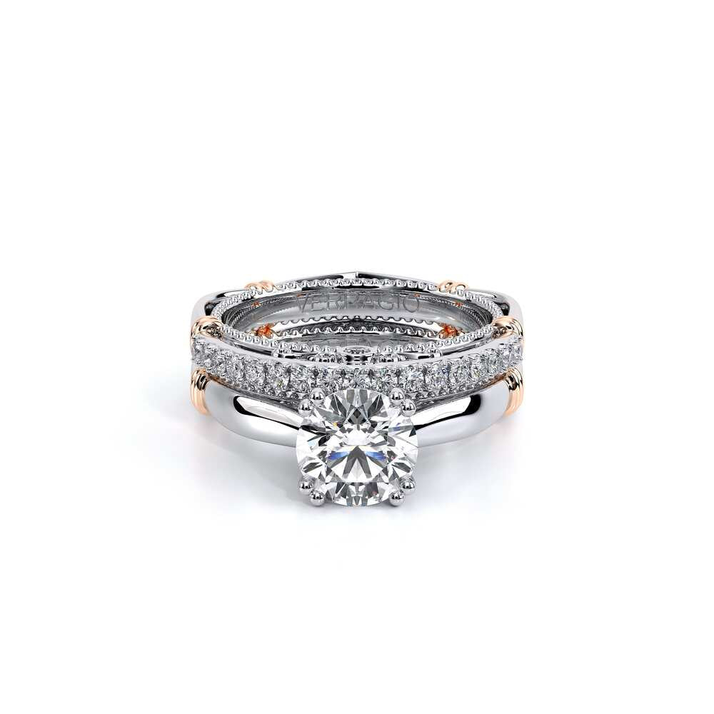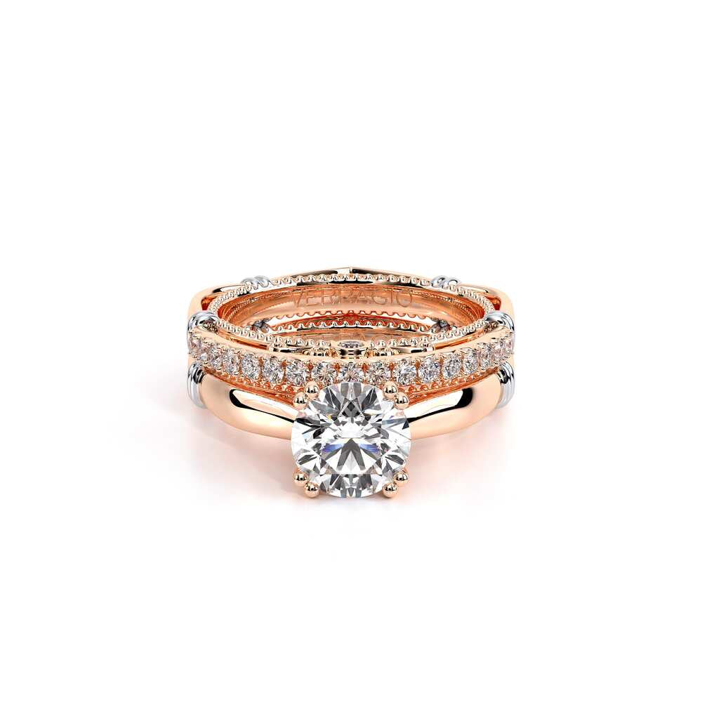 Parisian-106R is a classic engagement ring that features pave set twisted diamond band with a brilliant round halo, Parisian Lace detail, our Verragio signature beading and lastly adorned with rose gold Timeless wraps.